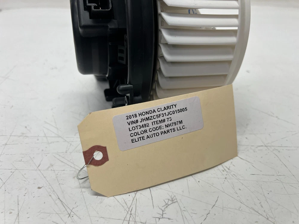 ELITE AUTO PART 2018-2021 HONDA CLARITY A/C HEATER BLOWER MOTOR FAN UNIT ASSEMBLY , GOOD USED CONDITION . LOT3492 # 73 part #OEM Look through pictures caref ully and make sure this is exactly the part you are looking for. What yo u see is what you will receive. DONOR CAR:--------- 2018 HONDA CLARITY VIN#----------------------------- JHMZC5F31JC015005 ENGINE:------------------------- 1.5L 4 COLOR:-------------------------- GRAY NH797M TRANSMISSION:------------ AUTOMATIC FWD MILES:------------------44K MILES