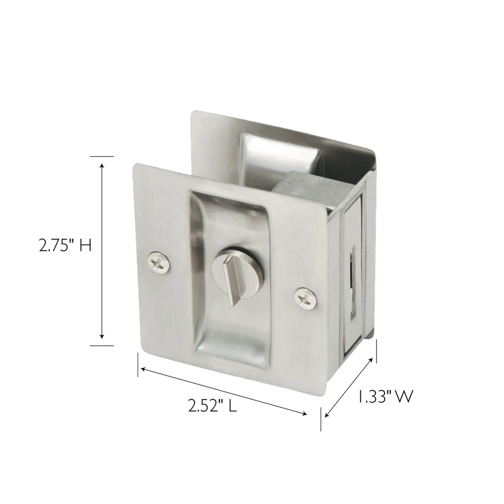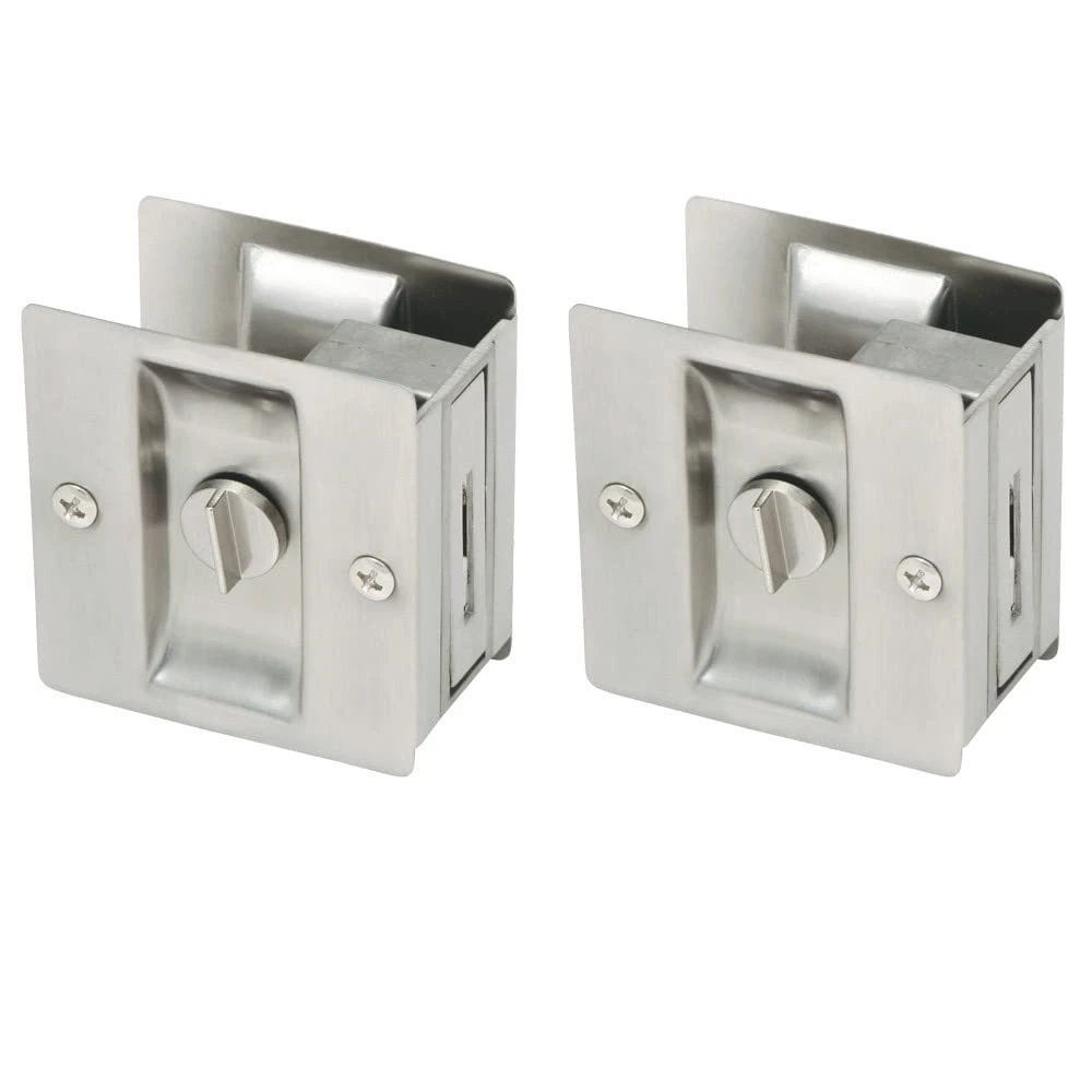 The 182121 2-Pack Rectangular Privacy Pocket Door Passage is finished in satin nickel. Ideal for sliding closet doors, this pocket allows you to smoothly open and close doors when needed. The twist-knob lock allows you to use this for bathrooms or other rooms where privacy is desired. This door hardware is made of solid brass and measures 2.75-inches by 2.52-inches by 1.33-inches. Designed and manufactured by , the trusted source for quality lighting, hardware, plumbing, kitchen, and bath products for every taste and budget. Mounting hardware included for easy installation Can be mounted on left and right hand doors Boasts a sleek, satin nickel finish Twist-knob lock allows you to use this where privacy is desired This item measures 2.75-inches by 2.52-inches by 1.33-inches