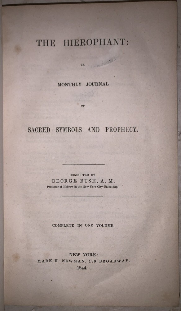 The Hierophant: or Monthly Journal of Sacred Symbols and Prophecy Conducted by George Bush, A.M. Complete in One Volume New York: Mark H. Newman 1844 First Edition Octavo, ii, 288 pages, publisher's original gilt lettered black cloth covered boards with blind-stamped decoration. Some minor rubbing and wear, minimal discoloration, else in very good + condition. The Hierophant: or Monthly Journal of Sacred Symbols and Prophecy, edited by George Bush and published in New York in 1844, was a periodical dedicated to the exploration of religious symbolism and prophetic literature. Through its 12 issues, released between June 1842 and May 1843, the journal offered theological insights and interpretations of sacred symbols, drawing connections to broader religious and philosophical themes. It served as a platform for scholarly discourse on the significance of prophecy and its role within sacred texts. Aimed at deepening readers' understanding of spiritual and symbolic dimensions, The Hierophant reflected the intellectual and theological curiosities of its 19th-century audience, contributing meaningfully to contemporary religious scholarship. If you have any questions, feel free to ask, and don't forget to check out my other listings.