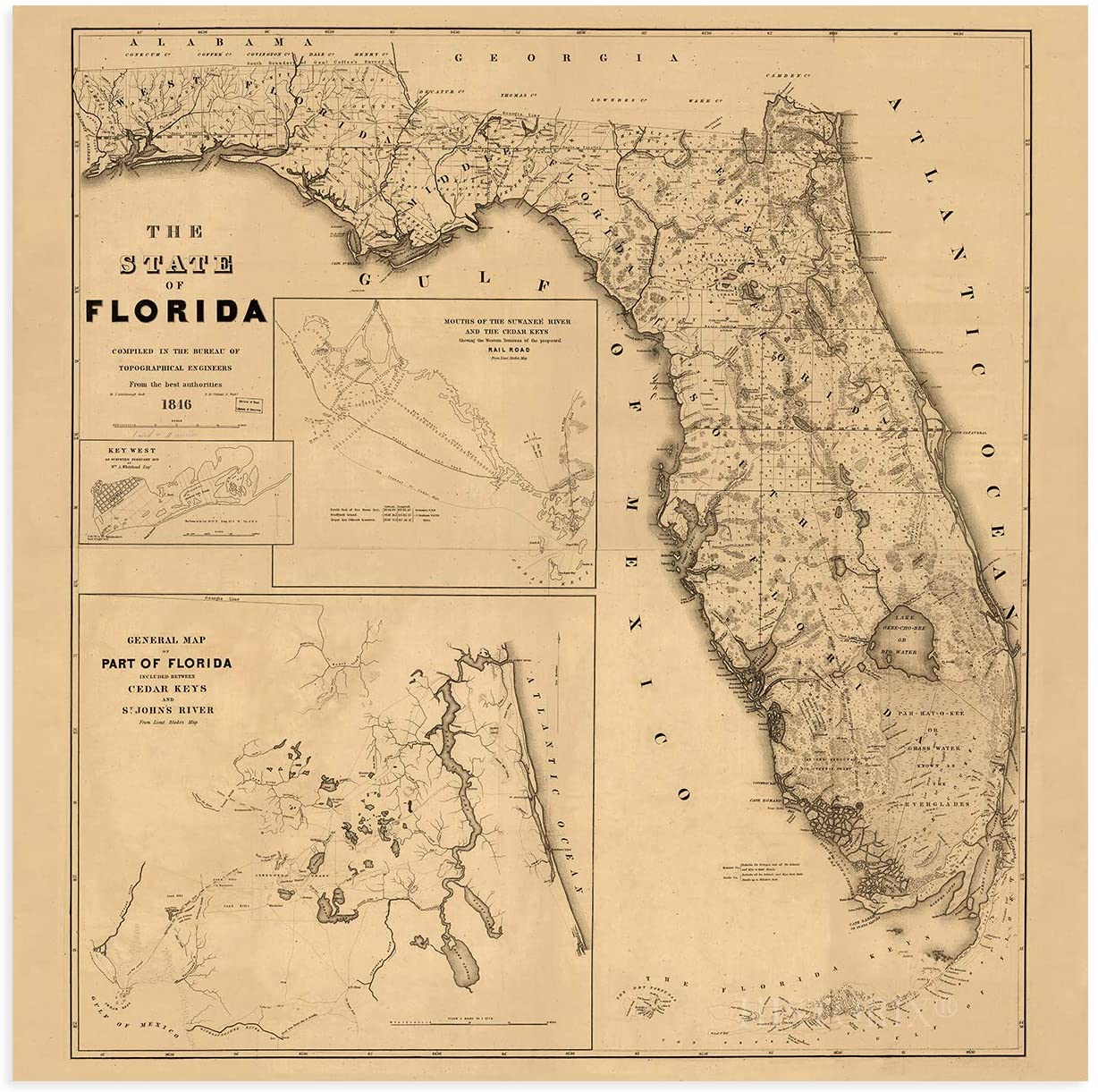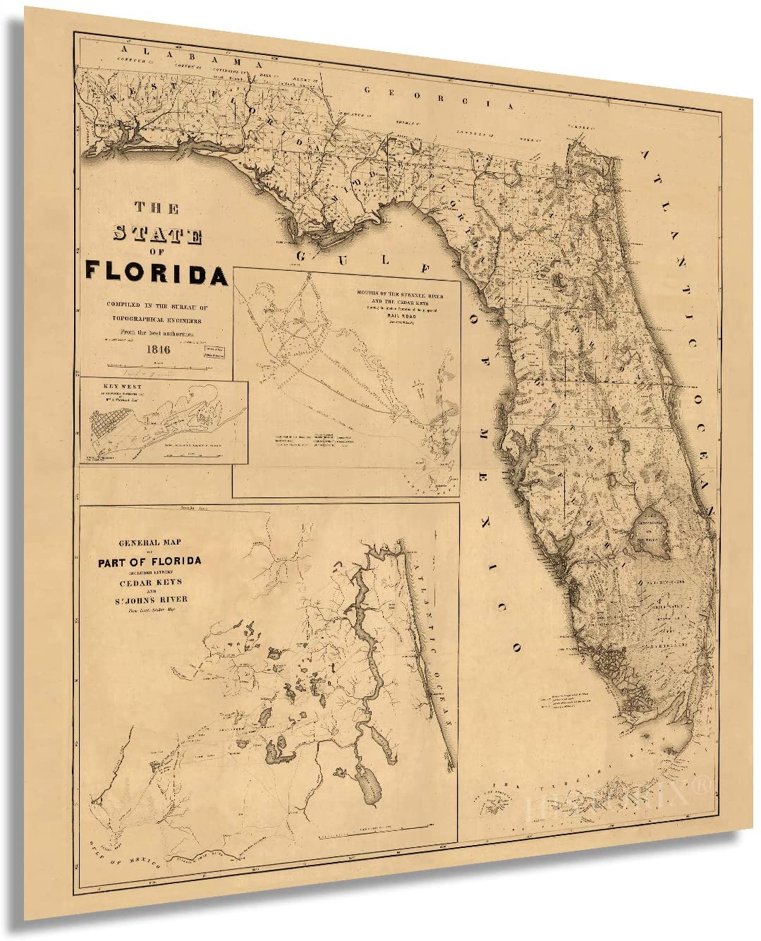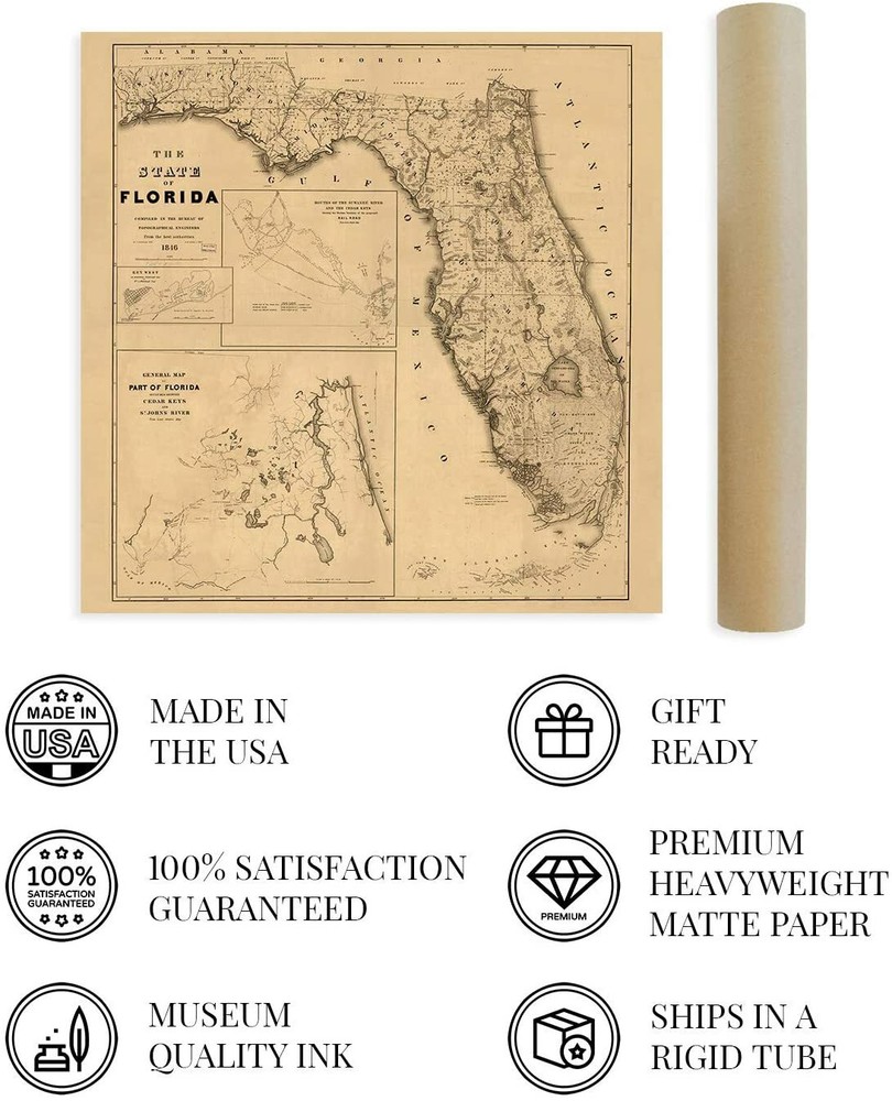 Feature Points VINTAGE MAP REPRODUCTION: You’ll love this high quality historic reproduction of 1846 Florida Map Poster. Our museum quality maps are archival grade, which means it will look great and last without fading for over 100 years. Our print to order maps are made in the USA and each map is inspected for quality. This beautiful artwork is a perfect addition to your themed decor. Vintage maps look great in the home, study or office. They make a perfect gift as well. MUSEUM QUALITY: This high quality map print will be a great addition to your vintage-themed wall. Don't waste money on cheap-looking, thin paper posters. We use thick, fine art print quality matte paper. Our professional’s choice matte paper displays artwork in high detail without glare. The color is vibrant and text is easy to read. When framed, this map looks absolutely stunning. A LOOK BACK AT HISTORY: This is an impressive, historic reproduction of 1846 Florida Map Poster. This print is from an original found in the maps and geography division of the US Library of Congress. A true piece of history. See our product description section for more fascinating information about this historic map and its significance. READY TO FRAME: This print includes a 0.2 inch border for a perfect frame fit and look. Our maps are designed to fit easy-to-find standard frame sizes, saving you money from having to pay for a custom frame. Each map is inspected for quality and shipped in a rigid tube. HISTORIX: We love history and art. Sometimes old maps have tears, folds, separations and other blemishes. We digitally restore and enhance maps while keeping its historical character. All our maps are proudly made in the USA. Customers all over the world love our vintage maps and we know you will too. Additional Information Distinguished by four distinct regions this 1846 map of the State of Florida shows a land in a time of both growth and transformation. The significance of these regions to the history of the state is unique in that East Florida and West Florida were merged into a territory in 1822. Disputes with Spain and indigenous peoples continued throughout Middle Florida and South Florida. With the annexation of East and West Florida the territories were finally unified and Florida became the 27th state in 1845. This was the first registered map depicting Florida as a unified state and includes borders with Georgia and Alabama showing the nation emerging into something recognizable as modern American geography. Home to Everglades National Park, the largest protected wilderness area east of the Mississippi, Florida has always been renowned as an outdoorsman’s paradise. Florida is also the site of the Ernest Hemingway Home and Museum as the noted author made his home in the Florida Keys for more than a decade and wrote some of his most important works there. The museum attracts visitors from across the globe and is still home to his famous five toed cats. Our museum quality, restored map is printed with archival ink on heavy matte stock and comes ready to frame in a sturdy cardboard tube ensuring safe travel and 100% satisfaction. This is the perfect gift for the outdoorsman, Hemingway fan, or historian in your life and makes the perfect addition to any office, lodge, library, or classroom.