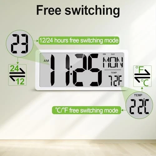 Menu 1. We require immediate payment. 2. We currently accept payment via eBay managed payments only. 3. Once payment is cleared, we will dispatch your shipment within 1-3 business days. Please refer to the "Shipping" tab for more information regarding shipping speed to your destination. 18.5" Extra Large Digital Wall Clock Battery Operated Wall Clock with Time/Calendar/Temperature Jumbo LCD Display Count Up Down Timer Alarm Clocks for Home Office Bedroom (Batteries Included) Product description 18.5 "HD EXTRA LARGE DIGITAL WALL CLOCK: High contrast clear jumbo digit wall clock is boasting 5.9-inch ultra-big digits, it is easy to read from far distance at any angle. This digital alarm clock can show the time, date, month, day and temperature, bring you clear and comfortable visual sense. digital clock is great for living room, kitchen, bedroom, classroom, gym, nursing home and office DIGITAL WALL CLOCK BATTERY POWERED: This digital clock is powered by 4 AA batteries and 2 AAA batteries (included). It can be placed in two ways, one is mounted on the wall with two keyholes on the back, and the other is placed on a desktop with a folding back stand MULTIFUNCTION DIGITAL CLOCK: The large display digital clock has 3 modes: timer, alarm, clock. You can just press mode button to change the mode, easy to operate. Wall clock digital has 3 alarm settings for weekdays, weekends, every day to meet your different needs. 12 or 24 hour display formats with indoor temperature display in ℃ or ℉, meet your various needs. Easy to set TIMER WITH COUNT UP/DOWN FUNCTIONS: Available timing period for 0-29 hr 59 min 59 sec. T will be 90 sec DIDI ringing when countdown ends. Because of the memory function, the timer can remember your last setting if you did not turn it off. Large digital wall clock is perfect for kitchen cooking, beauty, exercise, classroom teaching and kids time management ALARM CLOCK WITH SNOOZE FUNTION: digital day calendar alarm clock with 5-minute snooze function. When the alarm clock sounds, press the "SNOOZE" button on the back of the wall clock, allowing you to sleep for another 5 minutes. After 5 minutes, the alarm clock will ring again. atomic clock will be your reliable assistant for wake-up service PLEASE MESSAGE US IF YOU HAVE ANY OTHER QUESTIONS, AND MANY THANKS FOR READING ALL OF THIS. Copyright ©#. All Rights Reserved.