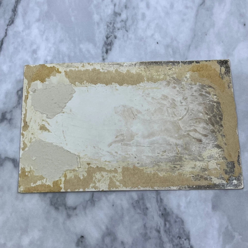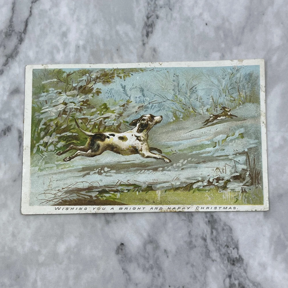 See pics for condition. 1880s Embossed Christmas Victorian Trade Card Hunting Pointer Dog EA4-1