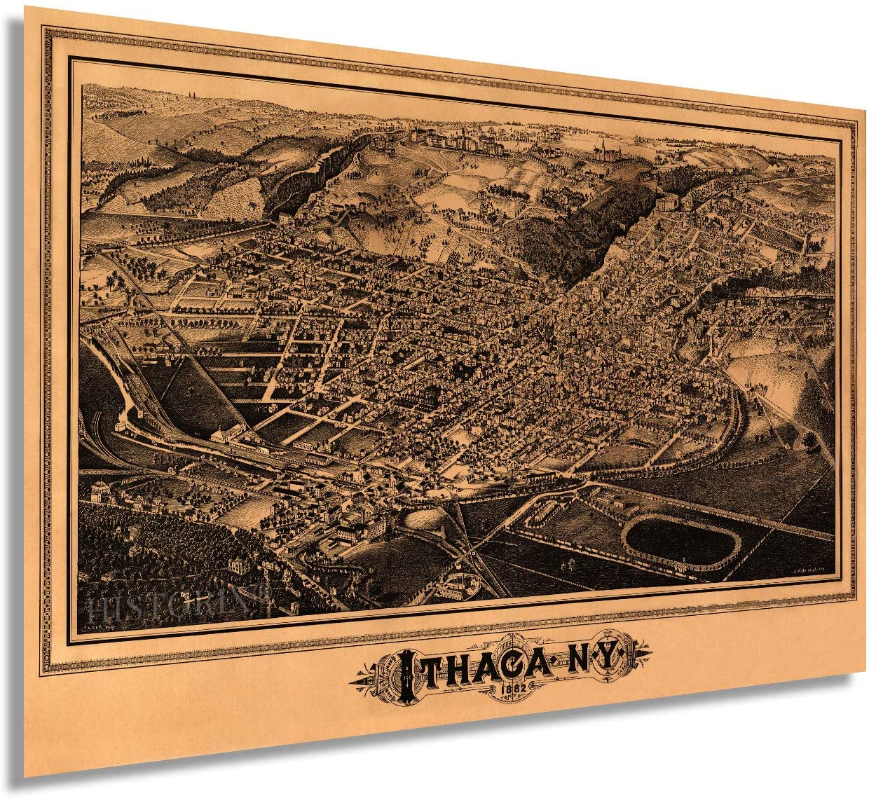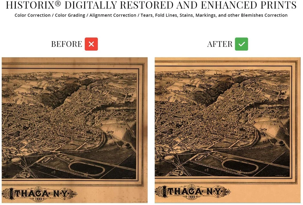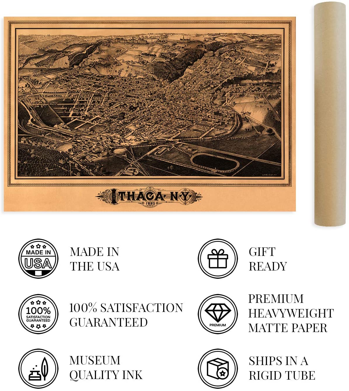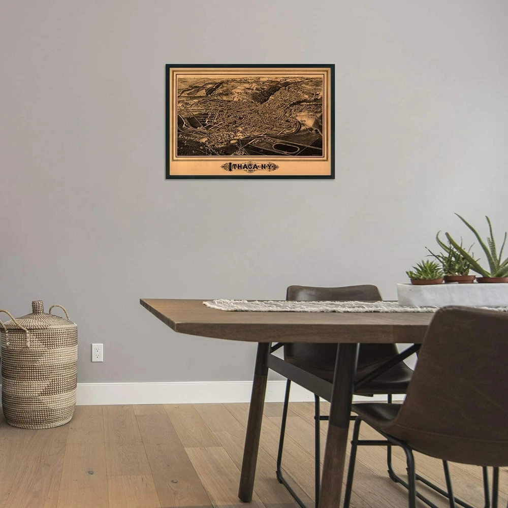 Feature Points VINTAGE MAP REPRODUCTION: You’ll love this high quality historic reproduction of 1882 Ithaca New York Map Print. Our museum quality maps are archival grade, which means it will look great and last without fading for over 100 years. Our print to order maps are made in the USA and each map is inspected for quality. This beautiful artwork is a perfect addition to your themed decor. Vintage maps look great in the home, study or office. They make a perfect gift as well. MUSEUM QUALITY: This high quality map print will be a great addition to your vintage-themed wall. Don't waste money on cheap-looking, thin paper posters. We use thick, fine art print quality matte paper. Our professional’s choice matte paper displays artwork in high detail without glare. The color is vibrant and text is easy to read. When framed, this map looks absolutely stunning. A LOOK BACK AT HISTORY: This is an impressive, historic reproduction of 1882 Ithaca New York Map Print. This print is from an original found in the maps and geography division of the US Library of Congress. A true piece of history. See our product description section for more fascinating information about this historic map and its significance. READY TO FRAME: This print includes a 0.2 inch border for a perfect frame fit and look. Our maps are designed to fit easy-to-find standard frame sizes, saving you money from having to pay for a custom frame. Each map is inspected for quality and shipped in a rigid tube. HISTORIX: We love history and art. Sometimes old maps have tears, folds, separations and other blemishes. We digitally restore and enhance maps while keeping its historical character. All our maps are proudly made in the USA. Customers all over the world love our vintage maps and we know you will too. Additional Information Produced by prolific American lithographer and illustrator L.R. Burleigh, this bird’s eye perspective, shows Ithaca, NY in a time of significant growth and transformation. Cornell University had been founded only 14 years earlier, and the little town on Lake Cayuga was burgeoning with expanded trade and manufacturing industries. The Ivy League university has attracted students internationally and is amongst the most respected in the nation. Ezra Cornell’s founding principle held that any person should have access to instruction in their chosen field, and it was established as a private, non-sectarian institution. Burleigh’s distinctive aesthetic was popular during this era, and these illustrations were bought by merchants and residents alike as a way to demonstrate their civic pride. His work primarily focused on cities in the Northeast and is featured in the Smithsonian Art museum. This signature style immediately transports the viewer back in time. The 1880s marked the development of Ithaca from a small town to a center of trade; trolley was built, and railway hubs expanded access to the finger lake region. The region supported numerous dairies and small farms, and Cornell’s dedicated dairy research center has long supported New York’s milk and yogurt industries. While the city had not been impacted much by the Civil War, the decades following its end presented the opportunity for the region to expand its rail access. While the steep hills and proximity to Lake Cayuga posed engineering challenges, Cornell financed the project to help foster growth and prosperity for the city. Our museum quality giclee print comes printed with archival ink on premium heavyweight matte paper. Shipped in a sturdy cardboard tube your print will arrive ready to be framed. This eye-catching vintage map reproduction print makes the perfect gift for anyone that loves history and imagery.