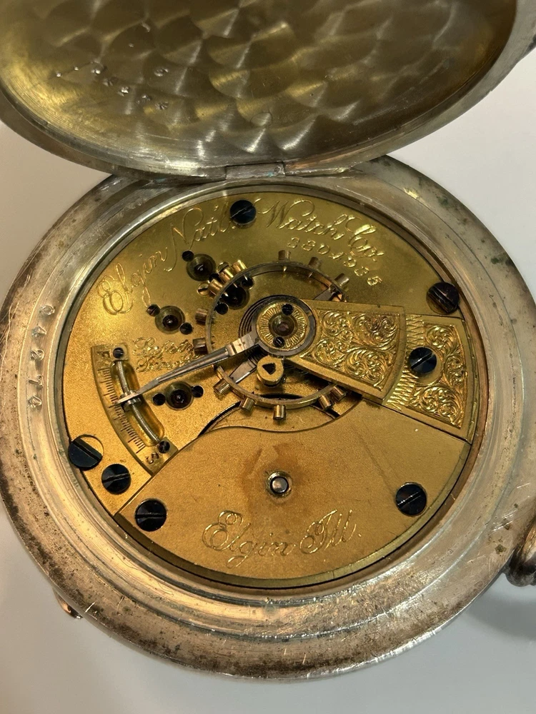 Elgin pocket watch coin silver very heavy all parts intact just stop working .