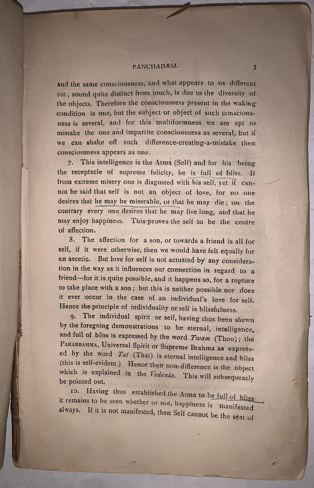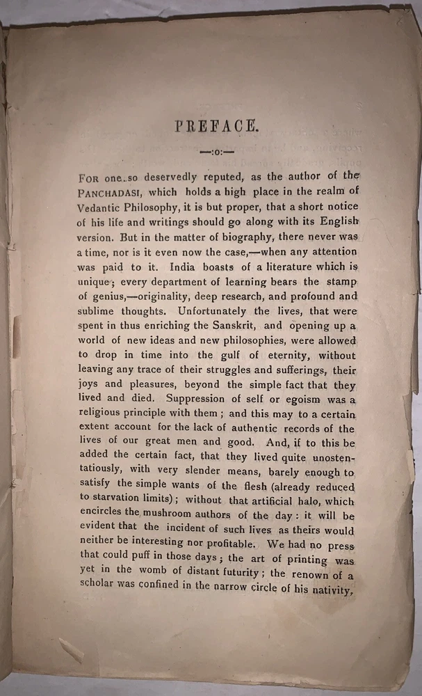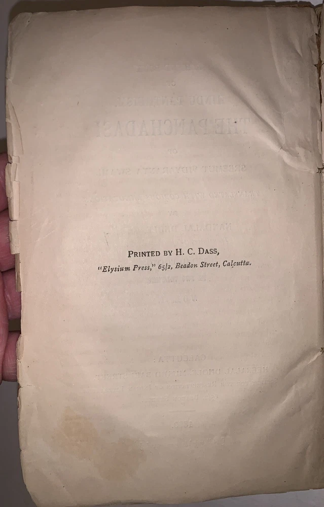 A Hand-Book Of Hindu Pantheism The Panchadasi Of Sreemut Vidyaranya Swami Translated with Copious Annotations by Nandalal Dhole, L.M.S. Second Edition Two Volumes in One Calcutta: Heeralal Dhole 1899-1900 Octavo, 333 pages, publisher's original brown wraps. Title in manuscript to top wrap. Top wrap and the first few pages are a little loose. Some tears to wraps and spine, rubbing and wear, some discoloration, previous owner's inscription, else in good + condition. A Handbook of Hindu Pantheism: The Panchadasi of Sreemut Vidyaranya Swami is a comprehensive English translation and commentary on the Panchadasi, a seminal text of Advaita Vedanta attributed to the 14th-century philosopher Vidyaranya Swami. The Panchadasi explores the nature of ultimate reality, the self, and liberation, emphasizing the non-dualistic philosophy of oneness between the individual soul (Atman) and the universal consciousness (Brahman). Divided into fifteen chapters, the text is grouped into three sections—Viveka (discrimination), Deepa (illumination), and Ananda (bliss)—each addressing a specific aspect of spiritual realization. This edition serves as an accessible guide to the profound teachings of Hindu pantheism, bridging ancient Sanskrit philosophy with modern readers through detailed explanations and insights. It remains a vital resource for those seeking to understand Hindu metaphysics and the principles of Advaita Vedanta. If you have any questions, feel free to ask, and don't forget to check out my other listings.