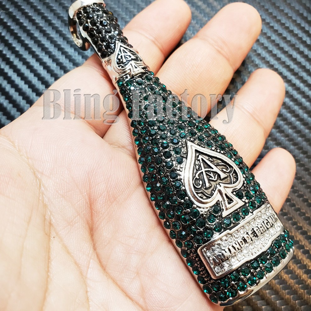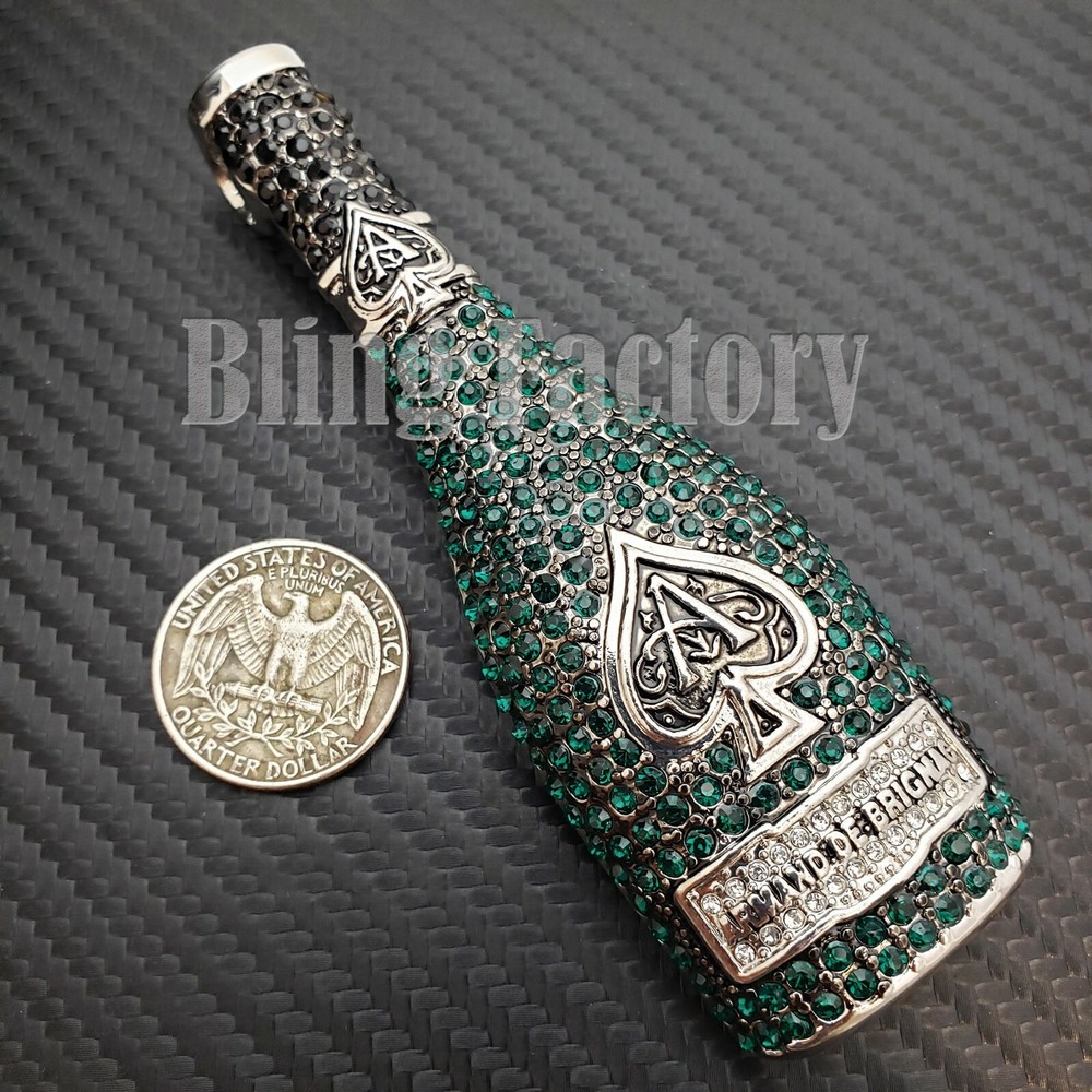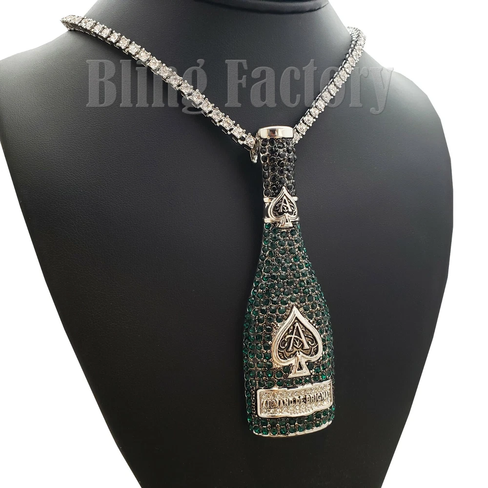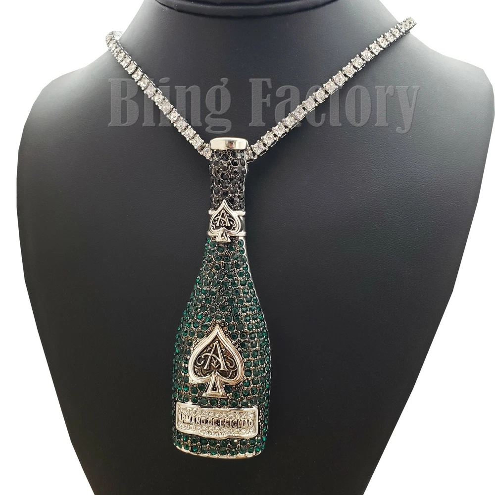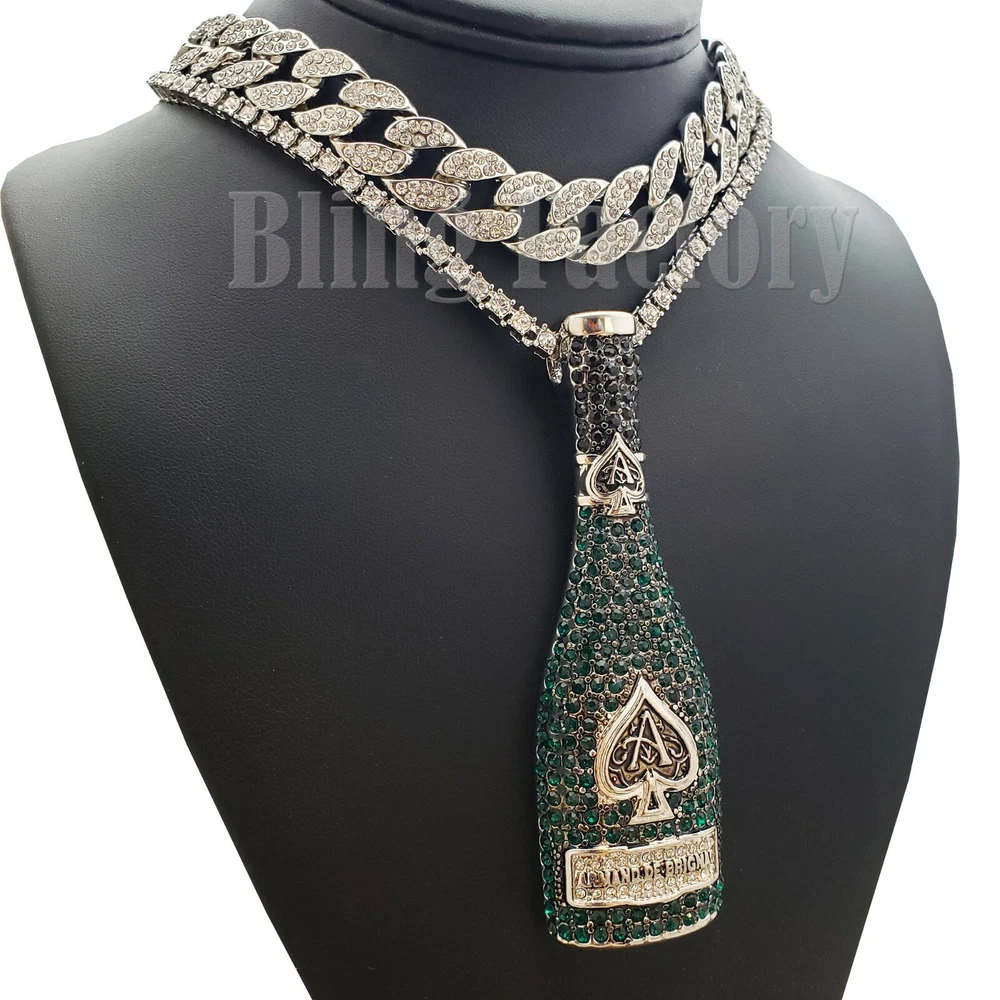ACE OF SPADE LIQUOR BOTTLE & 18" Full Iced Cuban & 1 ROW Tennis Choker Chain Set HIP HOP CELEBRITY STYLE BRAND NEW USA SELLER Product Description Iced 18" Miami Cuban Choker The piece featured here is made with cuban style, thick links. each one covered with cubic zirconia accents through out the chain. The necklace is a nice, thick piece. Made with White Gold finish over alloy. Very popular, celebrity style piece. Unique, All fresh design. Makes a perfect piece to wear by itself very trendy hot and popular item. Chain length : 18", width : 15mm 1 Row Diamond Necklace : Chain Length : 18" Chain Width : 4.5mm COLOR: White Gold Plated Lab Simulated Diamonds Pendant : WHITE GOLD PLATED SIZE OF PENDANT: 1.25" WIDE X 4" TALL Lab Diamonds High Quality and polished. Payments: US Customers: Paypal accepted International Customers: Paypal accepted Shipping: For Shipping & Handling within the US: FREE We do combine shipping! We ship via USPS (Post office) First Class Mail Tracking Info will automatically be posted via Paypal and ebay. Approximate Delivery Times: US: 2-5 BUSINESS DAYS Canada: 1-2 weeks Europe: 1-6 weeks South America: 2 weeks Australia: 2 weeks Asia: 2 weeks We do everything possible with the packaging to ensure it arrives to you in perfect condition. If you have any questions please feel free to ask. Returns: 100% Satisfaction Guarantee! Exchanges: We replace defective items if sent back within 14 days upon receipt. Lost or Damaged Items: If insurance is purchased, items will be reshipped absolutely Free of Charge. (Damaged goods must be sent back) Refunds: If the item is in new condition, we can accept returns less s&h charges and a 20% restocking fee. Please email first for return authorization.