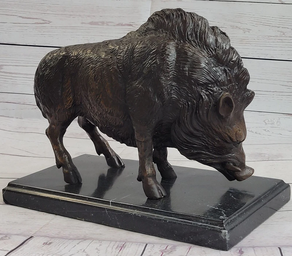 18LBS Signed ART Statue Bronze Marble wild boar Wild Pig & hunting dog WAR Art 18LBS Signed ART Statue Bronze Marble wild boar Wild Pig & hunting dog WAR Art Condition : This sculpture is in perfect condition Bronze Dimensions with Marble Base: Height 9 1/2" X Width 12" Marble Dimensions:12" X 7" Height without base:8 1/2" Weight:18 LBS Inventory:27-9944926572 Witness the captivating presence of the wild boar as it emerges from the forest's edge, exuding strength and defiance. This remarkable bronze sculpture captures the essence of this powerful creature with exceptional detail and artistry. From its alert gaze to the texture of its fur, every aspect of the boar has been meticulously crafted. Symbolizing warrior spirit, courage, and leadership in Celtic beliefs, the wild boar stands as a testament to bravery and perseverance. Its noble and fierce nature is beautifully portrayed in this handmade bronze sculpture, created using the ancient technique of lost-wax casting. The brown patina finish adds depth and character to the sculpture, highlighting the intricate details of the boar's form. Mounted on a black marble base, this sculpture becomes a striking focal point, whether displayed in a home, office, or gallery. The artist Moigniez's signature further enhances its quality and artistic value. Invite the spirit of the wild boar into your space and embrace the symbolism of strength and determination that it embodies. Wild Boar Pig Feral Hog Bronze Statue Sculpture Figure on Marble Base J. Moigniez 94492M Video will open in a new window Using the eBay App? Paste link into a browser window: [isdntekvideo] Shipping Terms : Most of our items are shipped via USPS (United States Postal Service) mail or UPS. Most orders are shipped within 24-48 hours of purchase. Please be aware that not all items are available for USPS shipping due to size and weight. We do ship to Hawaii, Alaska, Canada, Puerto Rico, APO/AE, and U.S. Virgin Islands, however, an additional charge may be required. Please contact us before making any purchases in these areas. For Non-USA customers, you may be responsible for all duty, tax, brokerage fees that may be due upon delivery (shipping costs cover freight charges only). We also ship internationally. Please refer to the "Shipping and Handling" chart for the rates for each area. Payment : We accept just about any form of payment. PayPal, Master Card, Visa or American Express credit cards. Money orders, cashiers checks, and even personal or business checks. For governmental institutions, we will also accept a purchase order. Please understand that for personal or business checks we have to wait for the check to clear (usually 7 days) before shipping. Condition : New Detailed Hand Crafted Hot Cast Bronze Satisfaction Guaranteed. This is Stock Photo, Slight Color Variation!! Listing and template services provided by inkFrog