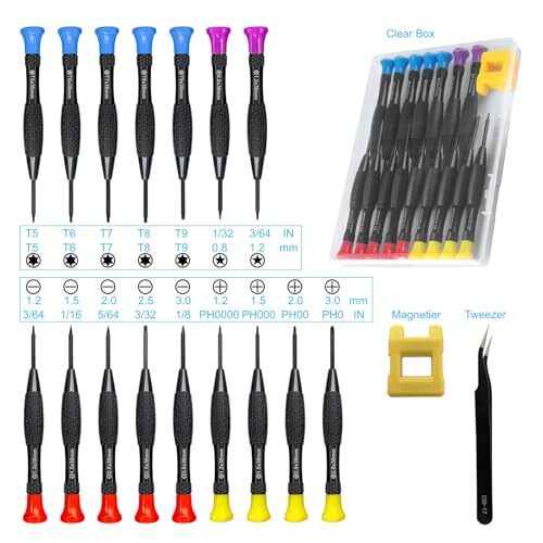 Return Policy Fast Delivery Trusted seller 18PCS Mini Precision Screwdriver Set With Case, Magnetic Small Flathead Phillips Pentalobe Torx Star Screwdriver Set Kit and Tweezers for Repairing Computer Eyeglass Phone Watch Product Description Blackened steel Wide Range of Applications: Precision screwdriver can easily tighten or loosen small screws in some household everyday products: glasses, watches, laptops, tablets, cameras, jewelry, Android / iPhone, toys and other electronic products Solid material: Small screwdriver sleeve rod Screwdriver sleeve rod is made of chromium-vanadium alloy steel blackening process,corrosion and oxidation resistant. The cutter head is magnetic and in addition, it is equipped with a magnetizer to make the screwdriver more capable of absorbing small screws. The ESD17 tweezers is made of stainless steel, painted to protect against static electricity and have prongs that can easily grip small screws Keep Organized: Mini screwdriver set with case is equipped with a transparent storage box to prevent loss, the screwdriver head comes in 4 different colors, red is a flathead screwdriver, yellow is a Phillips screwdriver, purple is a Pentalobe screwdriver, blue is a Torx screwdriver, and the handle is also marked with size and head edge, so it is easy to remove the screwdriver you want at a glance Compact Design: The head of the precision screwdriver kit is designed with a smooth rotating head, and the handle is covered with a fishscale frosted particle surface, which enables non-slip comfortable control and faster rotation of the screw when screwing What You Get: Precision Screwdriver Set With Case include 5 X red Flathead screwdrivers: 3/64IN(1.2) 1/16IN(1.5) 5/64IN(2.0) 3/32IN(2.5) 1/8IN(3.0); 4 X yellow Phillips screwdrivers: PH0000(1.2) PH000(1.5) PH00(2.0) PH0(3.0); 2 X purple Pentalobe screwdrivers:1/32IN(0.8) 3/64IN(1.2); 5 X blue Torx screwdrivers: T5 T6 T7 T8 T9; Tweezers: ESD17; Magnetizer; Transparent box Shipping Returns Payment Shipping Shipping is FREE to all addresses other than APO/PO boxes in the lower 48 states. All our stock ships from US-based warehouses. Shipped via USPS or UPS (depending on location and package weight) Unless stated otherwise, all orders will ship within 24-72 hours of your payment being processed. Check our feedback to see the great reviews of FAST shipping we offer. Returns Seller does not accept returns Payment We currently accept payment via eBay managed payments only. Once payment is cleared, we will dispatch your shipment within 1-3 business days. Please refer to the "Shipping" tab for more information regarding shipping speed to your destination.