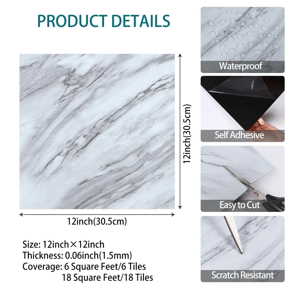 Transform your space with our 18-Pack Grey/White Marble Peel and Stick Vinyl Flooring. These 12x12 inch, 0.06 inch thick tiles are perfect for high-traffic areas, offering a durable, scratch-resistant, and pet-friendly surface. The low-luster, textured surface provides excellent anti-slip protection. Waterproof, oil-proof, and moisture-proof, these tiles are easy to clean and maintain, making them ideal for kitchens, living rooms, and even basements. With a faux marble design, they offer a low-cost alternative to real tiles. Installation is a breeze - simply peel off the backing and stick the tiles onto any smooth, dry, and clean surface. No grout or special tools needed. Each pack covers approximately 18 sq.ft. and is suitable for floors, walls, backsplashes, and more. Order enough pieces at once to ensure color consistency. ๐๐ก๐ข๐๐ค ๐๐๐ญ๐๐ซ๐ข๐๐ฅ: 18 pieces of sticky floor tile, 12x12 inches long, 1.5mm thick, coverage approx. 18 sq.ft. Made of high quality vinyl, thick enough to cover the high traffic area with strong adhesive. Scratch resistant, pet-friendly. Low-luster textured surface, anti-slip ๐ ๐๐๐ญ๐ฎ๐ซ๐๐ฌ: Waterproof vinyl floor tile, oil-proof, moisture proof, washable, easy to clean and maintain. It can also be easily removed without damage to the original surface, renter friendly. Faux marble design, provides a low-cost alternative to real tiles ๐๐๐ฌ๐ฒ ๐๐ง๐ฌ๐ญ๐๐ฅ๐ฅ๐๐ญ๐ข๐จ๐ง: Grey floor tile, self-adhesive, square design for easier installation, no grout or special tools needed, just peel off the backing and then stick the floor tile on any smooth, dry and clean surfaces, easy to cut with a utility knife or scissors ๐๐ข๐๐ ๐๐ฉ๐ฉ๐ฅ๐ข๐๐๐ญ๐ข๐จ๐ง: Stick on tiles for floor, walls, backsplash, countertops, furniture, fireplace, entryway, hallway, living room, RV; removable floor tiles for renters, floor tiles for bedroom, stick on floor tiles for kitchen, stick on floor tiles for bathroom, temporary flooring for apartments ๐๐๐๐: Please note that color of the picture may be slightly different from the actual product due to individual screen settings. It's better to buy enough pieces at a time to make sure they come from the same batch to avoid color difference. Feel free to contact us if you have any question