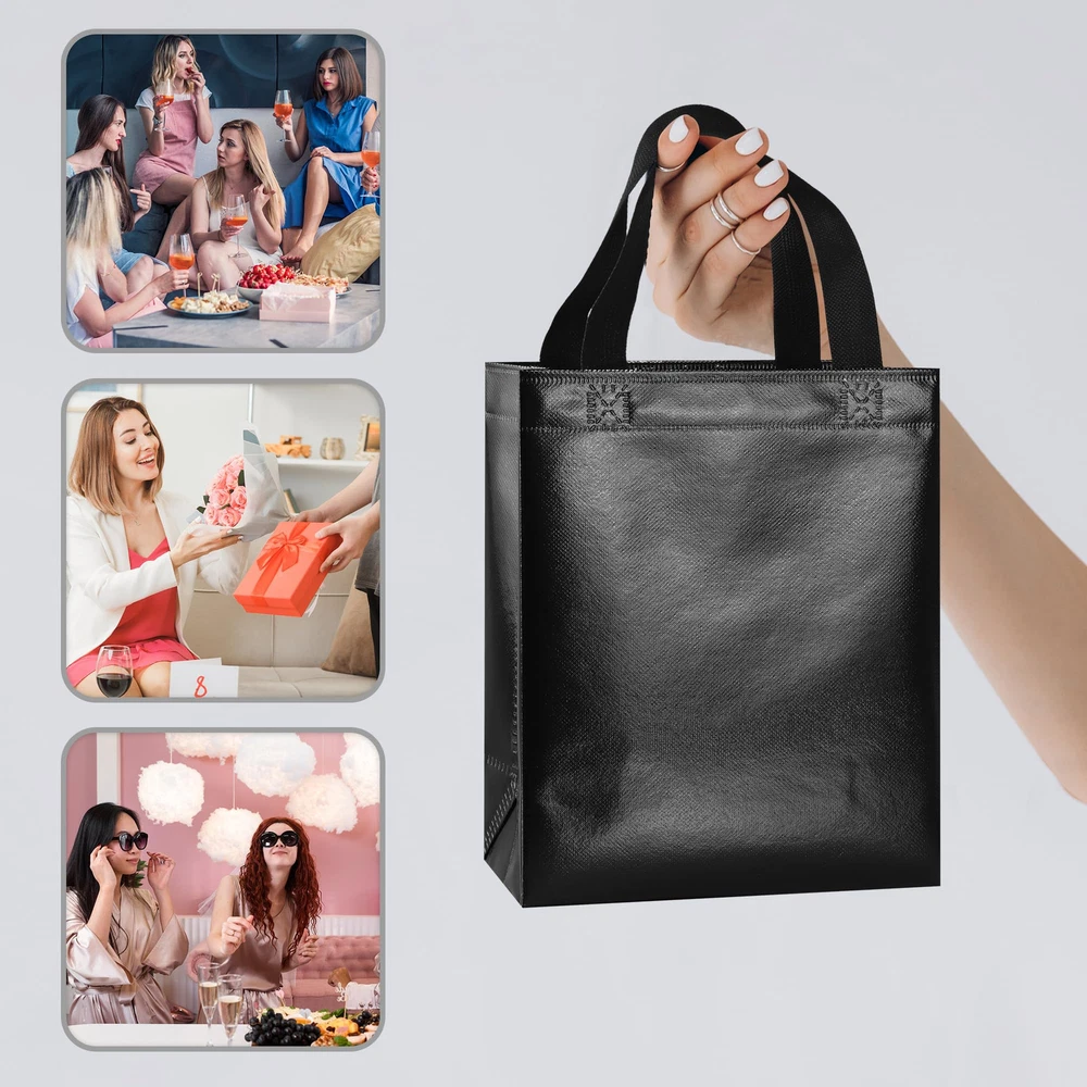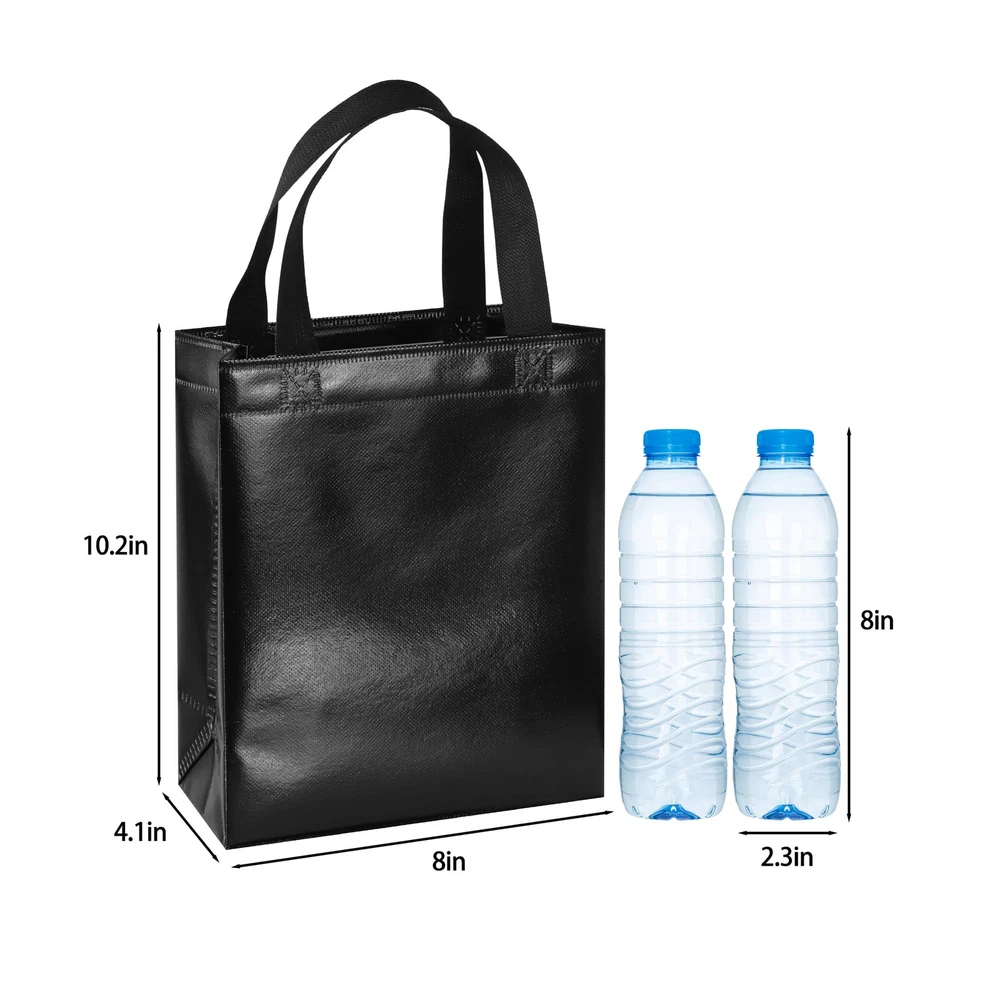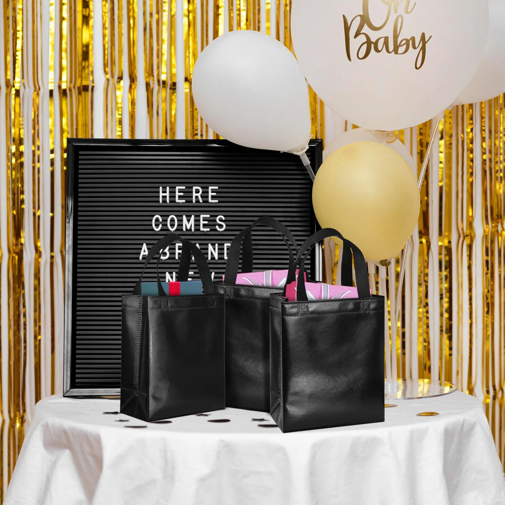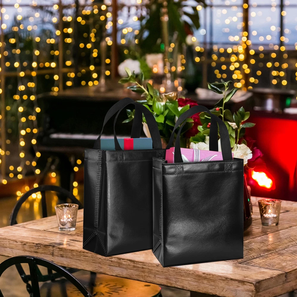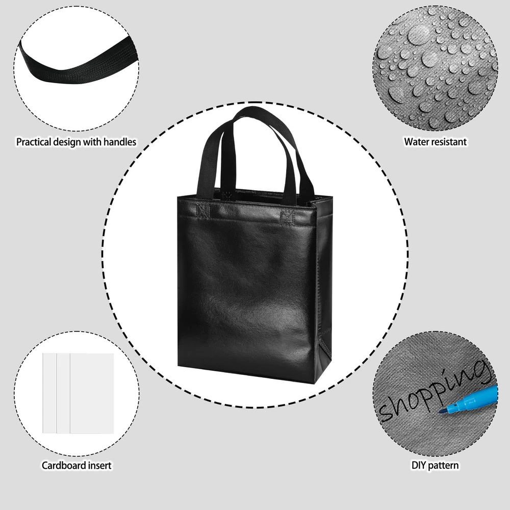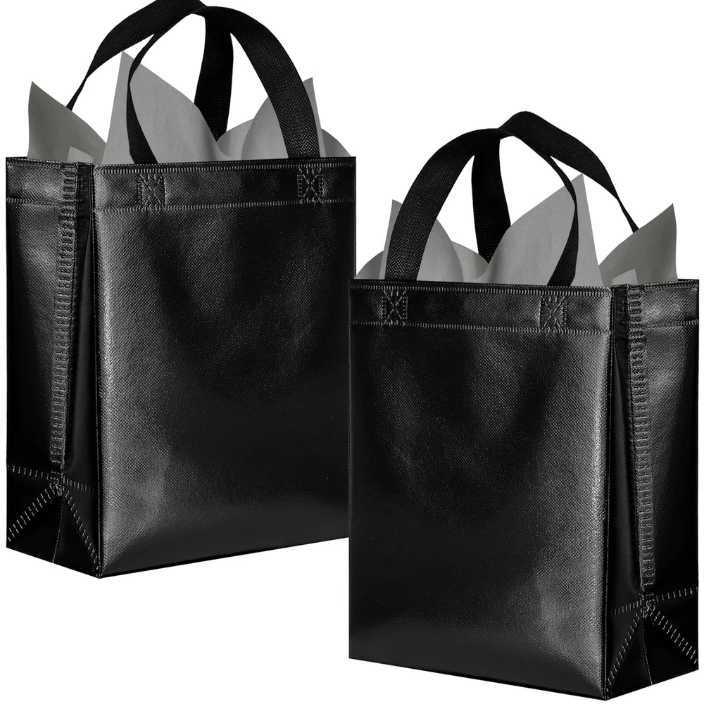 Package include: 18 black reusable gift bags and 18 matching tissues. Each gift bag has a cardboard card to prevent the bottom from bending and to keep the shape of the tote. The unique feature of these bags is that each bag will shine in different light, creating a beautiful reflection. Medium size: Each black bag measures 10.2 x 8 x 4.1 inches and is perfect for small gifts such as jewelry, gift boxes, necklaces, toys, dolls, etc. These bags are both beautiful and reusable, making them a new generation of party bags with more charm than paper bags. Durable and reusable: These black gift bags are made of polypropylene spunlace with aluminized film (store reusable bags are also made of polypropylene) that is not easily torn, waterproof and non-flammable. Applicable occasions: Suitable for party use or shopping stores, can be used as bridesmaid tote bags, wedding bags, party gift bags, goodie bags, shopping bags and other applications. DIY pattern: These non-woven bags are blank without pattern, use markers or stickers to decorate your bags, you can design these bags into the style you want.