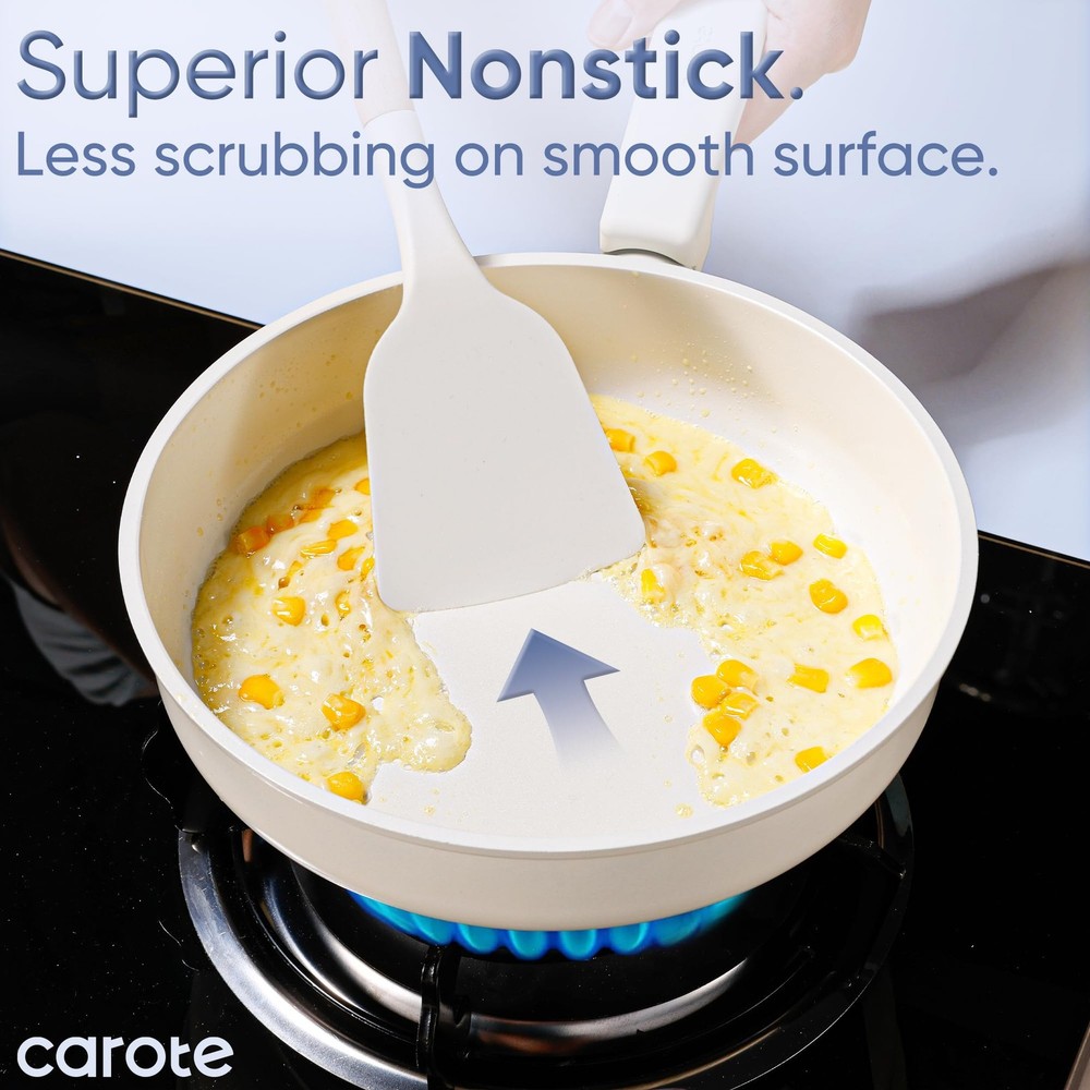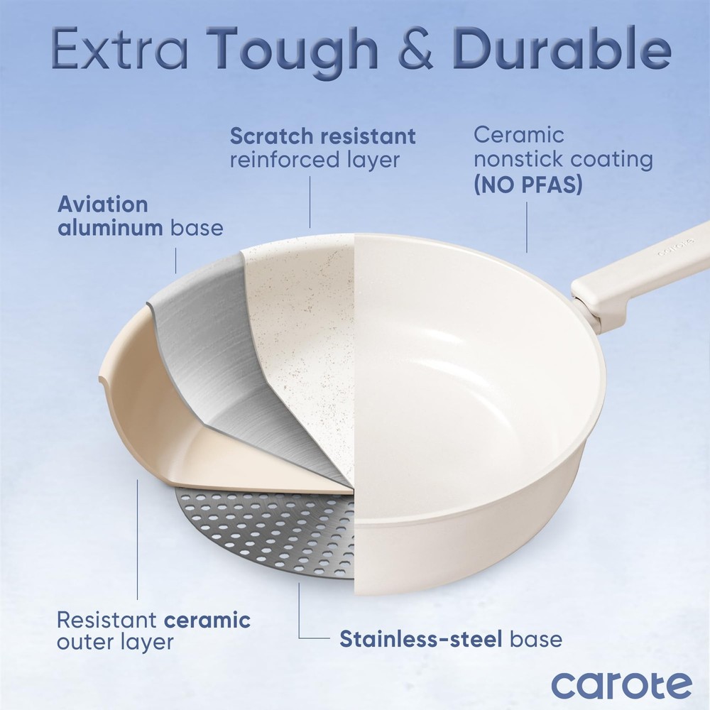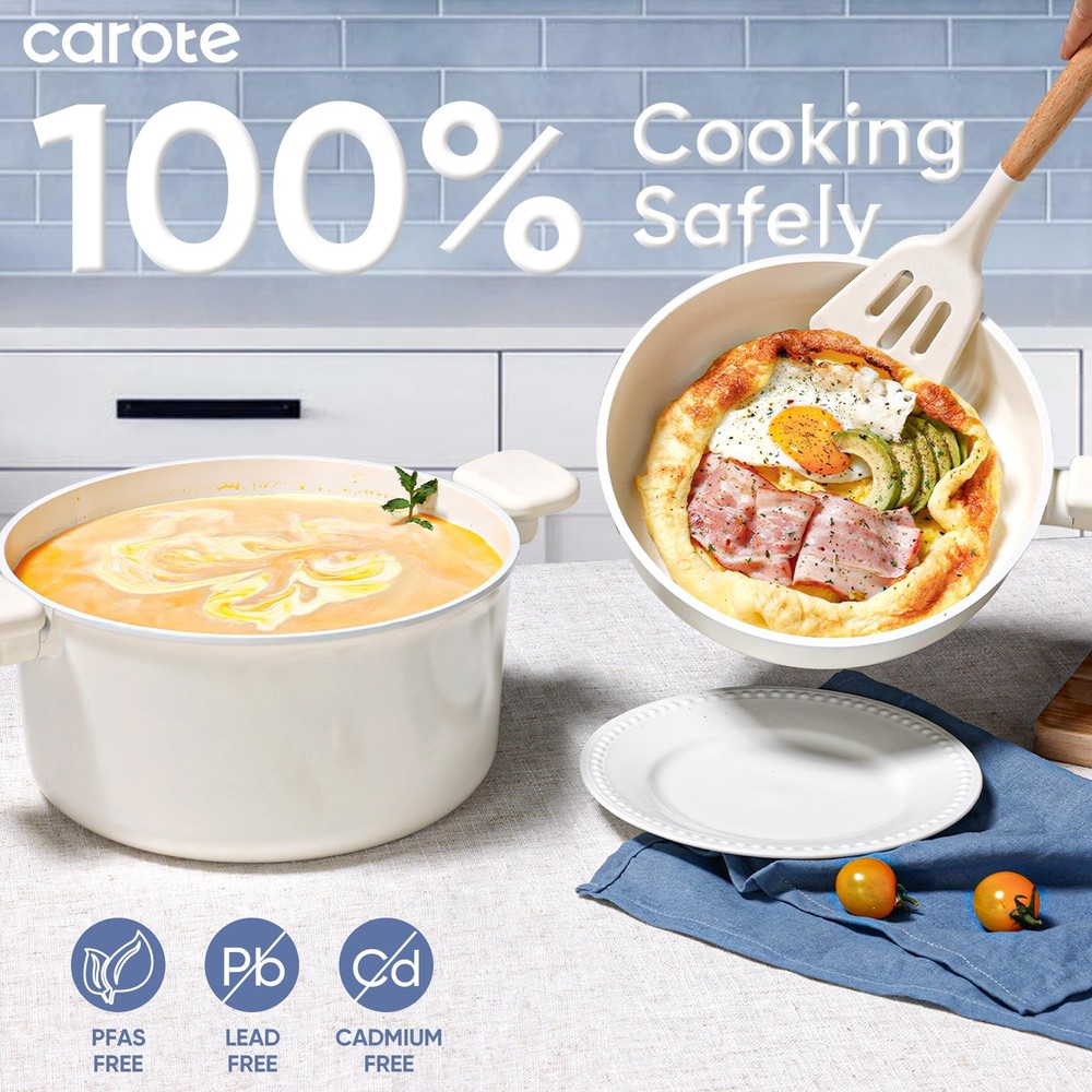 18Pcs Ceramic Pots and Pans Set Non Stick, Healthy Cookware Set, PFAS/PFOA Free, Kitchen Cooking Set with Frying Pans, Cream White Crafted with a non-toxic ceramic coating, our cookware brings high level non stick performance and elevate your cooking experience. The smooth ceramic coating doesn’t trap any food or sauce, and wipes clean with just a quick swipe or rinse, keeping your cookware looking brand new. Our cookware is free from harmful chemicals such as PFOA, PFAS, PTFE, lead and cadmium. With its robust design and high-quality ceramic coating, our cookware is built to withstand everyday cooking. While it's designed for durability, its non-stick surface ensures easy cleaning and consistent performance, meal after meal. provides 12 months warranty from the date of purchase. Please don't hesitate to reach out if any quality problem. You will be guaranteed to get satisfying solution. Set includes: 6'' fry pan, 8.5'' frying pan, 2-qt saucepan with lid, 5-qt sauté pan with lid, 5-qt casserole with lid, 7-qt casserole with lid, soup ladle, solid spatula,slotted spatula, 4*pan protectors.