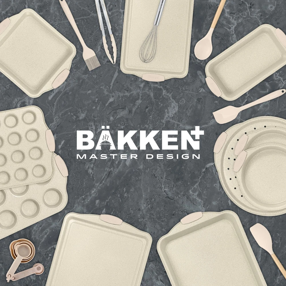 Material Carbon Steel Brand BAKKENMASTER Color White Marble Is Dishwasher Safe No Product Care Instructions Dishwasher Safe About this item COMPLETE 18-PIECE BAKEWARE SET: Includes various pans, trays, utensils, and measuring tools for versatile baking options. HIGH-QUALITY CONSTRUCTION: Made of durable carbon steel with a nonstick white marble coating inside and outside for easy release and cleaning. CONVENIENT SILICONE HANDLES: White silicone handles offer a comfortable grip and stay cool to the touch while baking. VERSATILE USE: Suitable for use in the oven, refrigerator, and freezer, making it perfect for baking a wide range of goods. TEMPERATURE RESISTANT: Withstands temperatures up to 446°F (230°C), ensuring reliable performance in high-heat baking environments.