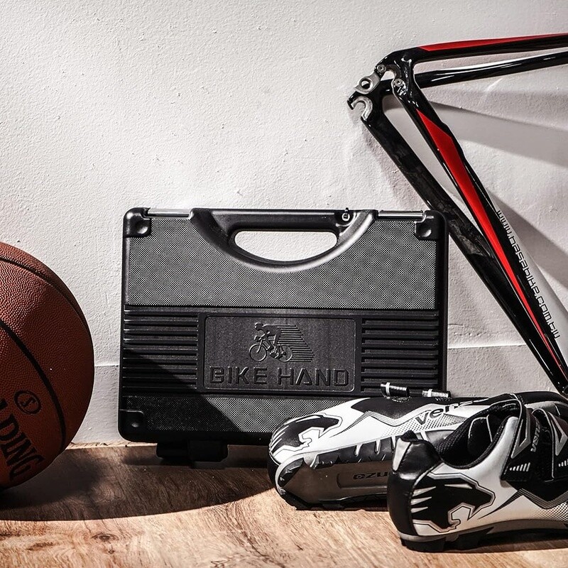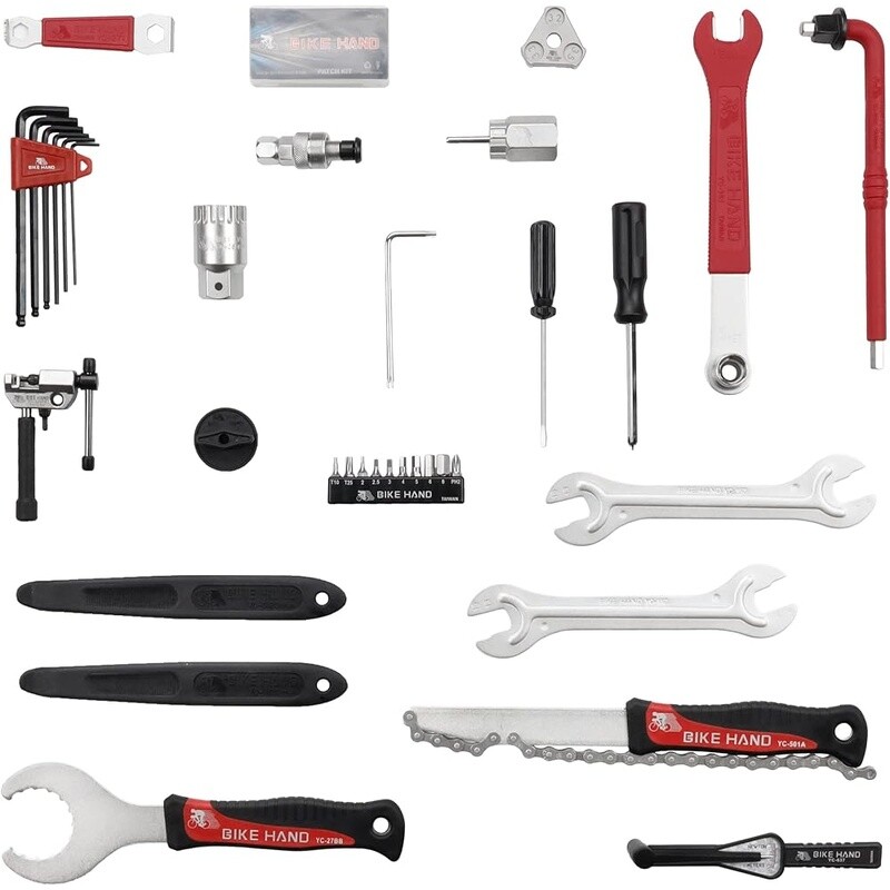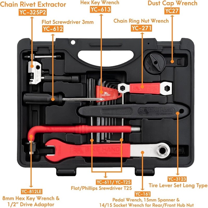 About this item TOOL KIT PART I: Chain Rivet Extractor; Flat Screwdriver 3mm; Hex Key Wrench; Chain Ring Nut Wrench; Dust Cap Wrench; 8mm Hex Key Wrench & 1/2” Drive Adaptor; Flat/Phillips Screwdriver T25; Pedal Wrench, 15mm Spanner & 14/15 Socket Wrench for Rear/Front Hub Nut. TOOL KIT PART II: Lock Ring Remover; Freewheel Turner; Hub Cone Spanner; Bottom Bracket Wrench; Spoke Wrench; Cartridge Bottom Bracket Tool; Crank Puller; Patch Kit; Essential Torque Wrench Kit. MADE TO LAST: All the tools are well built and constructed with pro-quality material, forethought, and genuinely exceptional with their attention to detail, which will prevent the tools wear through the years of use. Whether you are heavy bike enthusiasts or professionals, if you are trying to get your bikes fixed, then this tool kit is undoubtedly the best choice for you to have as it will satisfy most of your bike maintenance needs. STURDY STORAGE CASE: The tools are well organized and firmly stay put in their niches inside a protective case with a strong metal clasp. The specially designed hard case will secure the tools in place and not cause any mess while carrying. ORDER NOW, WORRY-FREE! Made in Taiwan. Material: Metal Brand: Item dimensions L x W x H: 3. 15 x 9. 84 x 12. 99 inches Item Weight: 2. 4 Kilograms Included Components: Chain Rivet Extractor, Flat Screwdriver 3mm, Hex Key Wrench, Ring Nut Dust Cap 8mm Wrench & 1/2” Drive Adaptor, Flat/Phillips T25, Pedal 15mm Spanner 14/15 Socket for Rear/Front Hub Nut, Lock Remover, Freewheel Turner, Cone Spanner, Bottom Bracket Spoke Cartridge Tool, Crank Puller, Patch Kit, Essential Torque Kit See more