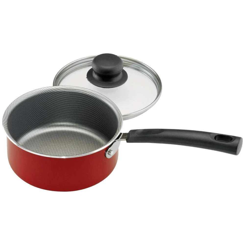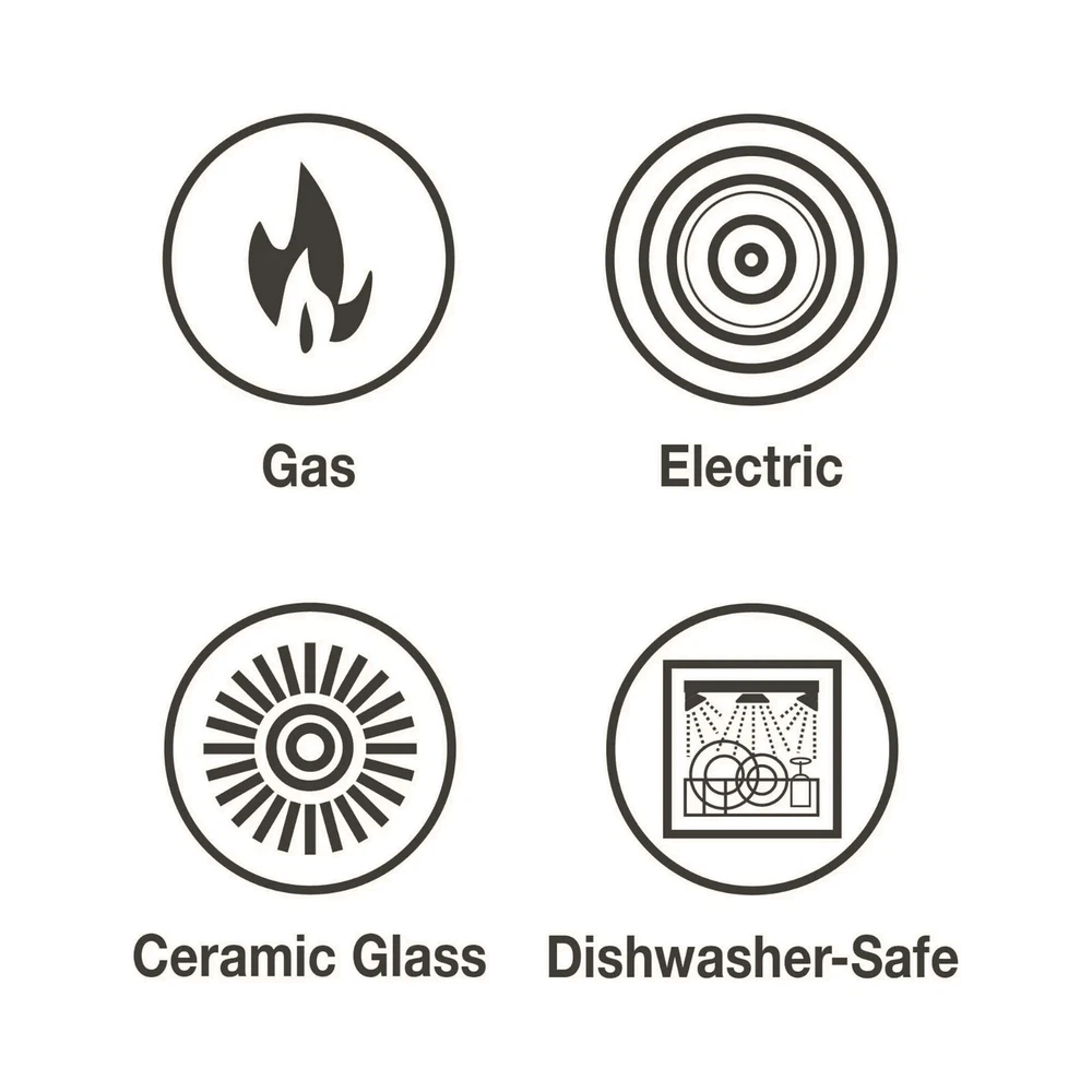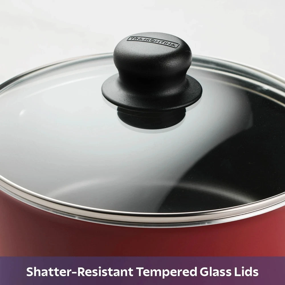 18-piece nonstick cookware set provides all the cookware essentials and is an excellent starter set. The patterned interior nonstick coating ensures easy cooking and simple cleanup. Available in two colors, the dishwasher safe cookware set makes prepping meals for one to many a breeze. Coordinating utensils and pots make this collection both practical and functional. This aluminum cookware set is lightweight and can be used by any level meal preparation person. Stay-cool handles decrease the chance of burning yourself when you are preparing and see-through lids lets you keep close watch on progress. The Tramontina's prima ware 18-piece nonstick cookware set works well with most range types. Riveted, stay-cool handles Heat and shatter-resistant tempered glass lids allow easy monitoring of cooking progress Dishwasher-safe Compatible with gas, electric and ceramic glass cooktops 8" sauté pan, 9" deep sauté pan, 11" griddle, 1 qt sauce pan with lid, 2 qt sauce pan with lid, 3 qt sauce pan with lid, 4 qt Dutch oven with lid (4 qt lid fits the 9" deep sauté pan), stainless steel foldup steamed, solid spoon, slotted spoon, solid turner, slotted turner, pasta spoon, ladle.