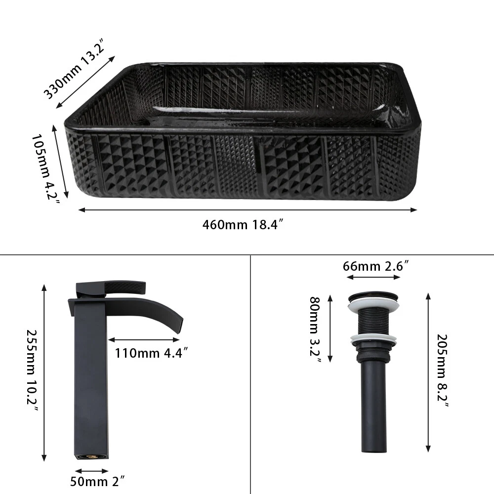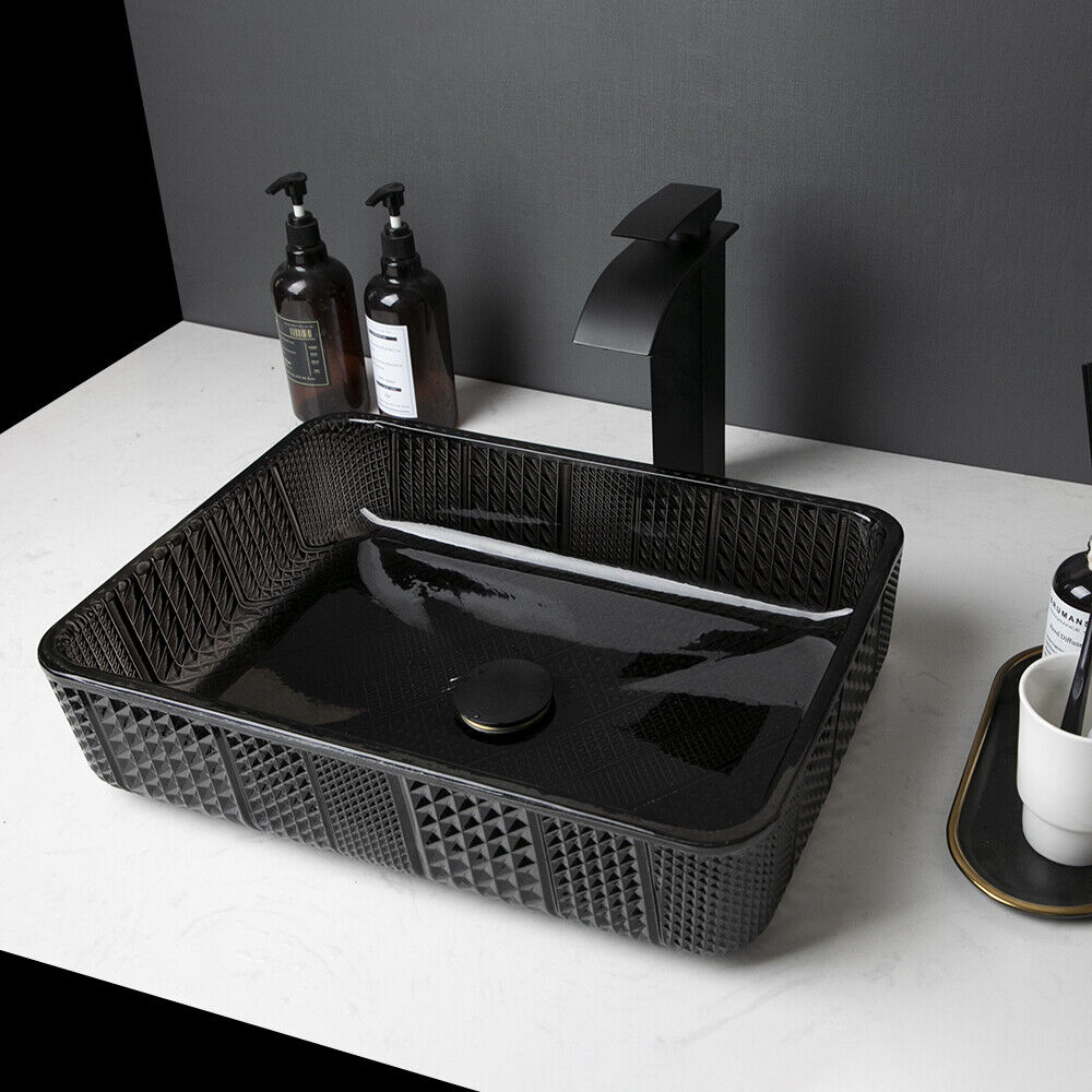Feature: Elegant European inspired design Modern contemporary art Quality award of Construction ceramics Countertop mount installation Feature:Bathroom Vessel Ceramic Sink Set Sink Material: Ceramic Sink Finish: Black Shape: Rectangle Faucet material: Brass Faucet Finish: Black Valve Core Material: Ceramic Faucet Installation Holes: Single Hole Gold pop-up drain included Comes with 24 months manufacturing warranty PACKAGE CONTENT: 1 x Ceramic Vessel Sink 1 x Mixer Faucet with cold & hot water hoses 1 x Pop up drain(Black) 18"Ceramic Black Bathroom Basin Vessel Sink Mixer Water Faucet Tap Drain Combo Feature: Elegant European inspired design Modern contemporary art Quality award of Construction ceramics Countertop mount installation Feature:Bathroom Vessel Ceramic Sink Set Sink Material: Ceramic Sink Finish: Black Shape: Rectangle Faucet material: Brass Faucet Finish: Black Valve Core Material: Ceramic Faucet Installation Holes: Single Hole Gold pop-up drain included Comes with 24 months manufacturing warranty PACKAGE CONTENT: 1 x Ceramic Vessel Sink 1 x Mixer Faucet with cold & hot water hoses 1 x Pop up drain(Black) Payment Delivery details Terms of sales About us Contact us Payment Payment is expected in 3 days after the end of Auction. So we can ship your item ASAP. When you paying with Paypal, please confirm your Ebay and Paypal address. Unpaid auctions must be reported to ebay, contact us if you need to file an extension for any late payment. Delivery details We ship this item from United States , it usually takes 2-8 days for delivery. No delivery to military addresses (Hawaii, Guam additional shipping charges apply) Terms of sales I describe items as well as I can. If I have missed something, please let me know. Please e-mail me before leaving feedback if you are unhappy with your item, so we can work it out. International Buyers – Please Note: Import duties, taxes, and charges are not included in the item price or shipping cost. About us Comes with 2 years manufacture warranty Exchange on defective item within 7 business days after the product is delivered. Shipping damage has to be reported within 5 business days of which the product was delivered. Contact us If you have any questions, please be free to contact with us, we will answer your questions ASAP. We will answer your question via email, please check your email for the answers. Our business time is from Monday-Sunday/8:00AM – 22:00PM
