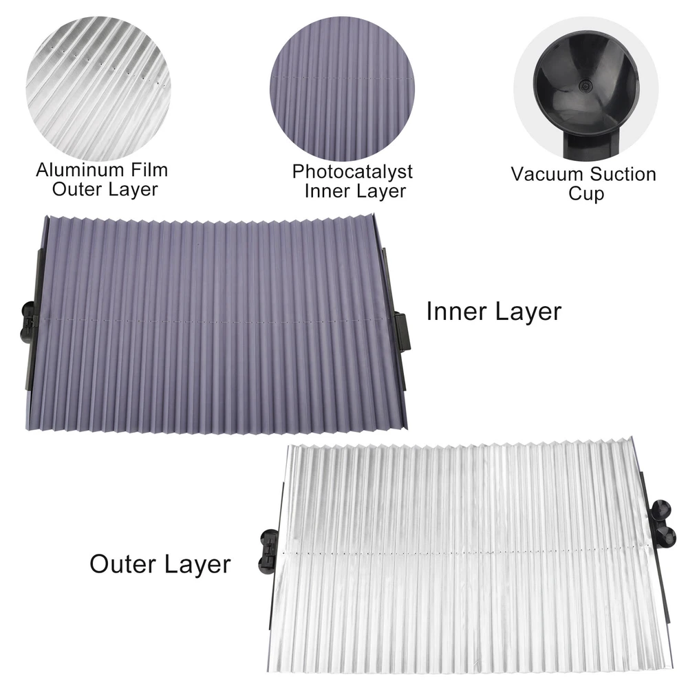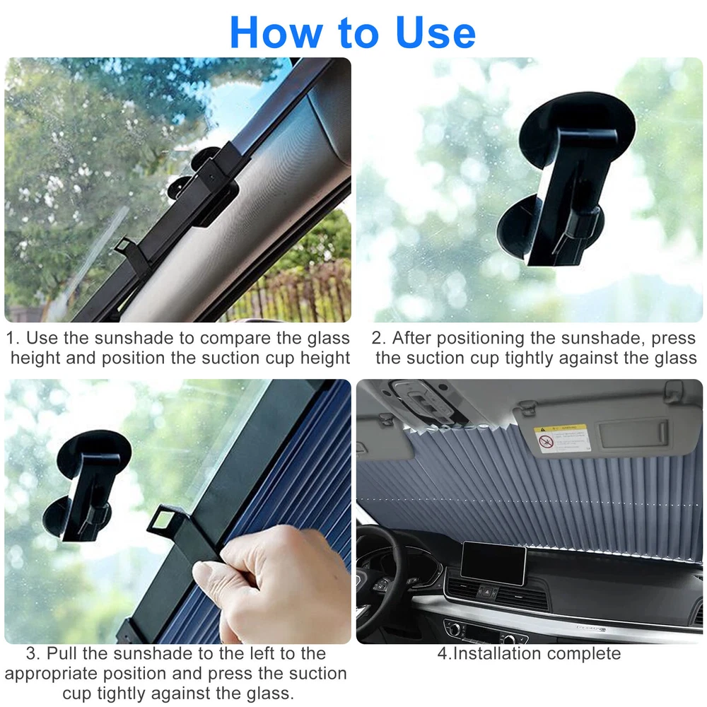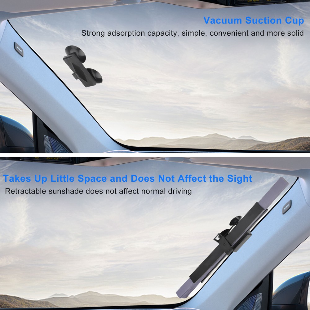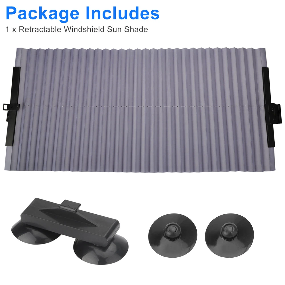 Product Feature ✨Effective Sun Protection: Crafted from aluminum foil alloy, this sunshade effectively reflects sunlight, blocks harmful UV rays, and reduces interior heat, keeping your car cool and protecting the interior from fading or cracking due to prolonged sun exposure. ✨Retractable Design: Designed conveniently, the retractable sunshade smoothly extends with a gentle pull and folds neatly when not in use. Its compact design ensures it fits snugly against the windshield without obstructing your view or taking up unnecessary space. ✨ Strong Suction Cups: Equipped with durable, high-strength suction cups, this sunshade stays firmly in place without sliding or detaching. The suction cups leave no sticky residue or marks, ensuring your car’s windows remain pristine. ✨Customizable Fit: Easily trim the 18 x 53" sunshade to match your windshield’s exact size for a precise and secure fit, making it versatile and suitable for various car models. ✨Hassle-Free Installation: Installing this sunshade is quick and effortless. Measure and cut to size, attach the right side using the powerful suction cups, and pull it across to secure the left side. ✨Note: Please measure your windshield to ensure the sunshade’s dimensions are compatible with your vehicle for a perfect fit. Product Specification Type Car Windshield Sun Shade Material Aluminum Foil Alloy Dimensions 18 x 53 inches Design Retractable Installation Method Suction cup Package Included 🎁1 x Car Windshield Sun Shade Location Descriptions To improve your buying experience and ensure fast delivery, Your order will be shipped from the warehouse located in either new jersey or california that is closest to your address. If you have any questions, Please contact us. Thank you for your support !