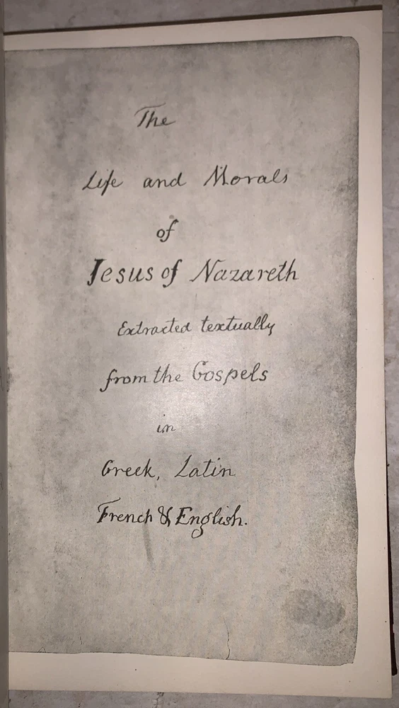 The Life and Morals of Jesus of Nazareth Extracted textually from the Gospel in Greek, Latin, French, and English by Thomas Jefferson With an Introduction Washington: Government Printing Office 1904 First Edition Limited Edition, intended primarily for members of Congress. With an ink stamp that reads "With the Compliments of J. A. Goulden," indicating that this copy was distributed by United States House of Representatives member Joseph Aloysius Goulden of New York. Octavo, 19 pages, followed by a facsimile of the Jefferson Bible. Bound in the original full red leather with ornate gilt decoration to boards and spine. Marbled endpapers. Some rubbing and wear, hinges cracking, discoloration to leather, damage to spine, else in good + condition. The Life and Morals of Jesus of Nazareth, often referred to as the "Jefferson Bible," is a unique work created by Thomas Jefferson around 1820. Compiled for his personal study, Jefferson meticulously cut and pasted passages from the Gospels of Matthew, Mark, Luke, and John to produce a chronological account of Jesus’ teachings and actions, focusing exclusively on his moral philosophy. Omitting miracles, references to divinity, and the Resurrection, Jefferson sought to present Jesus as a moral teacher rather than a divine figure. Originally unpublished during Jefferson’s lifetime, the manuscript was rediscovered by the Smithsonian Institution in 1895 and first published in 1904 by the U.S. Government Printing Office. Initially distributed to members of Congress, the book gained wider recognition over time and remains a significant reflection of Jefferson’s Enlightenment-era skepticism toward organized religion and his admiration for ethical teachings. If you have any questions, feel free to ask, and don't forget to check out my other listings.