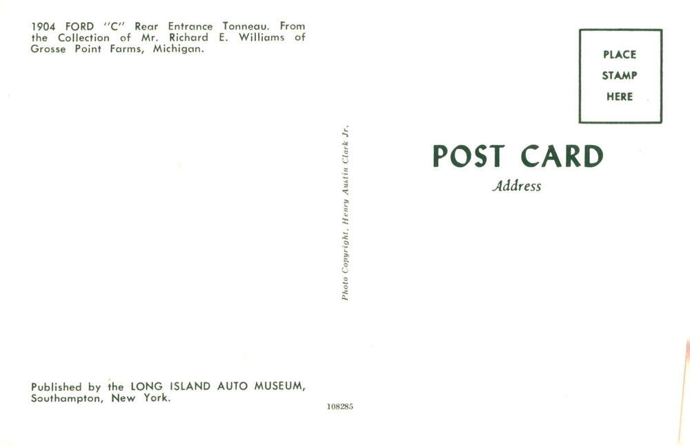 MAKE AN OFFER. THE MORE YOU BUY THE BETTER DEAL I WILL ACCEPT This postcard features a 1904 Ford Model C Rear Entrance Tonneau from the collection of Mr. Richard E. Williams of Grosse Point Farms, Michigan, published by the Long Island Auto Museum in Southampton, New York.