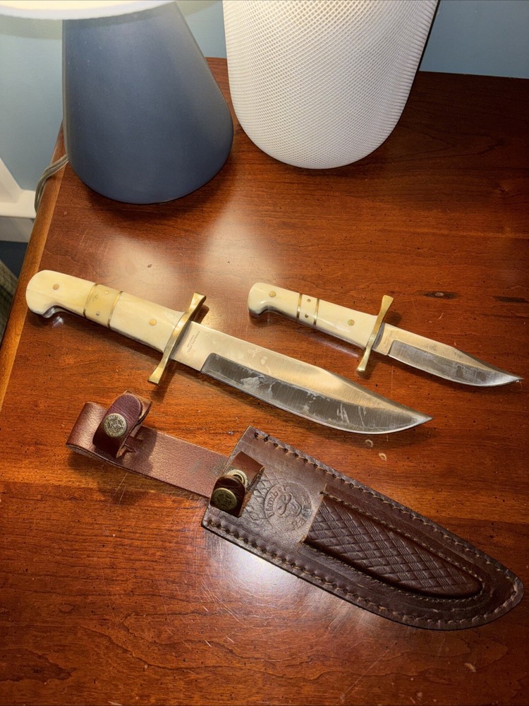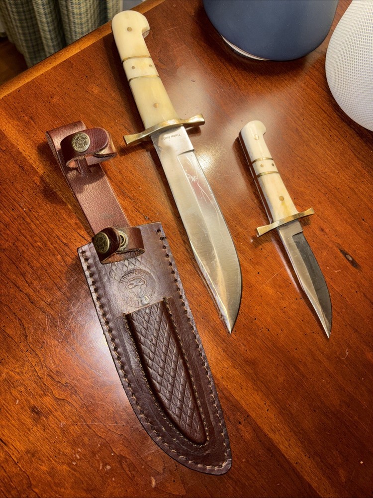 Got this item at the famous TV show “Pawn Stars” in Las Vegas!! Leather sheath having custom button closures etched with "Great Seal of the State of Oklahoma - 1907." circling a star motif. Timber Rattler small Classic Bowie knife having markings "Timber Rattler" on the ricasso. Full tang knife with bone scales and brass guard. Stainless steel. Overall length: 8 inches. Blade measures 4 inches. Handle measures 3.75 inches. 12 inch bowie knife also marked on the ricasso. Stainless steel. Overall measurements: 12 inches. Blade measures 6.25 inches. Handle measures 4.5 inches. Estimate: $1,500 - $2,500 just have no use for it anymore and I need the cash more right now.