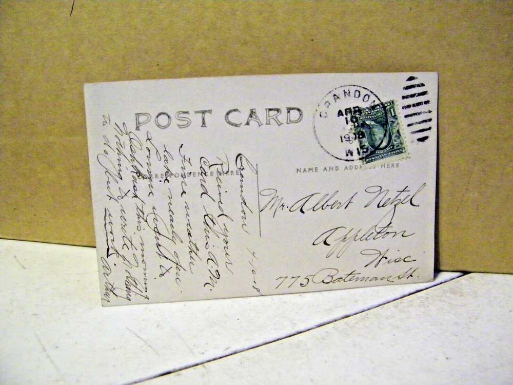 This vintage postcard from 1908 depicts the Crandon, Wisconsin community on the day 400 children marched on election day to protest"No Liscense" needed. The postcard, which is an original and not a licensed reprint, features a striking image of the packed town hall and the surrounding countryside. The postcard is a single unit and is classified as a topographical postcard under the category of collectibles. It is a great addition to any postcard collection and a piece of history from Wisconsin.