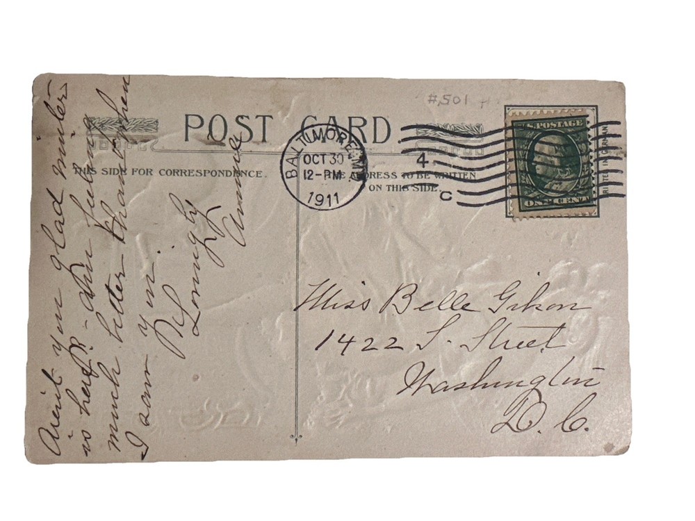 This 1911 Schmucker Pretty Girl Jack O'Lantern & Black Cat Halloween post card is a charming piece of holiday-themed memorabilia. Featuring a printed (lithograph) design with an embossed focus, this post card captures the whimsical essence of Halloween with its Jack O'Lantern and black cat motif. Manufactured during the era of divided backs (c. 1907-1915), this collectible item from Winsch is a delightful addition to any postcard collection, especially for those interested in holiday-themed postcards. Please look at all photos, and feel free to ask me any questions. I have many other passes take some time to look at my other items.