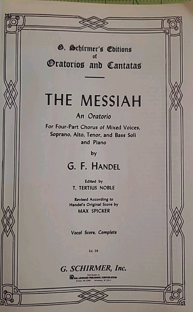 The Messiah – An Oratorio by G. F. Handel Schirmer’s Editions of Oratorios and Cantatas – Series Three Edited by Tertius Noble • Revised by Max Spicker G. Schirmer, Inc. • Copyright 1912 This is a complete vocal score edition of Handel’s Messiah, one of the most performed sacred choral works in history. This edition was specifically prepared for four-part mixed chorus (SATB), soloists, and piano, making it ideal for church choirs, university music departments, and professional choral performance. Unlike common reprints, this is an original early-20th-century Schirmer performance edition still sought after for its clear engraving, traditional voicing, and dependable editorial structure. Condition: • Solid binding All pages present • No missing sections • Light cover wear consistent with age • No stains, no loose pages • Interior clean and very usable This is an evergreen sacred performance score — not a modern reprint. USPS Ground Advantage (boxed, not envelope)