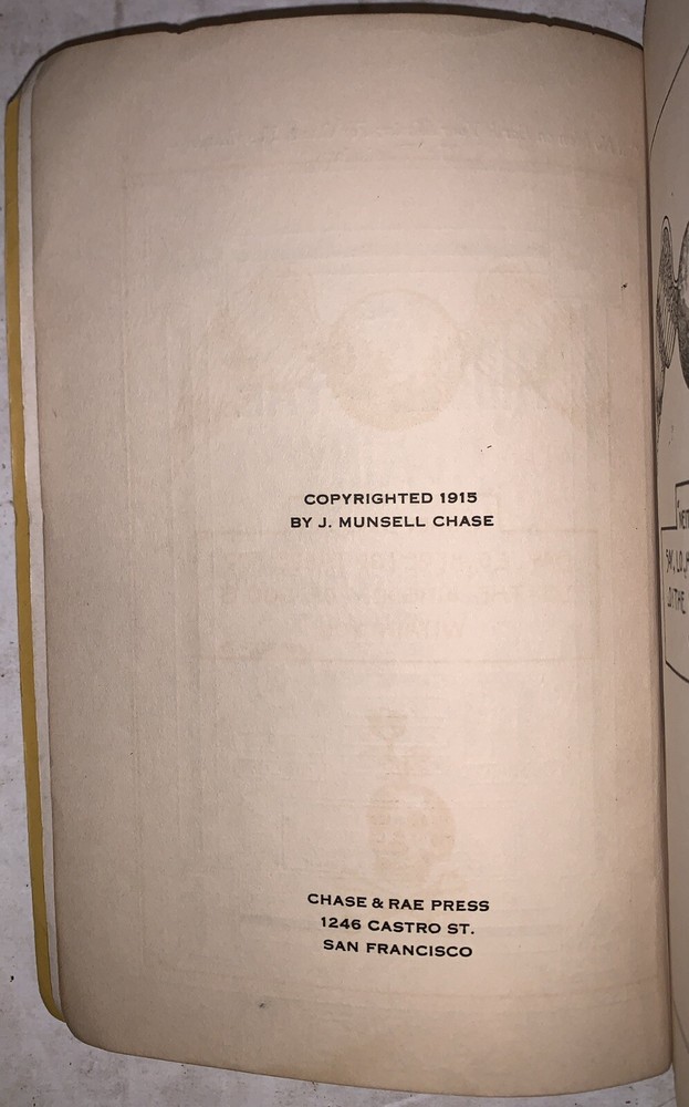 Binding: Softcover, Wraps Country of Origin: United States Year Printed: 1915 Author: J. Munsell Chase Place of Publication: San Francisco, California Subject: Religion & Spirituality Publisher: J. Munsell Chase Language: English Region: North America Special Attributes: 1st Edition, Illustrated Original/Facsimile: Original Topic: Occult