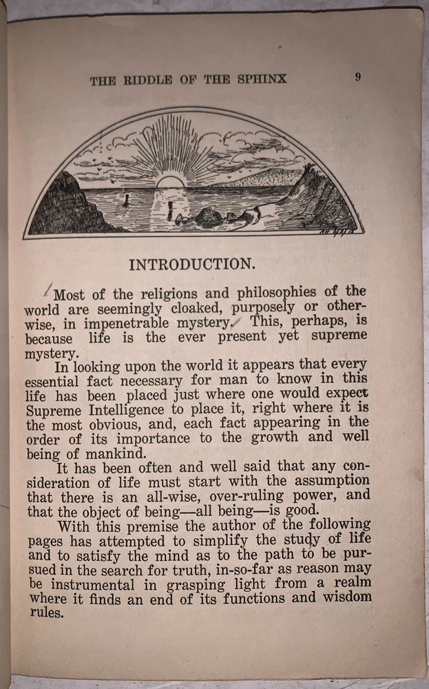 The Riddle of the Sphinx: A Key to the Mysteries and a Synthesis of Philosophy by J. Munsell Chase San Francisco, California: J. Munell Chase 1915 First Edition 12mo, 87 pages, publisher's original pictorial yellow wraps. Illustrated throughout in black-and-white. With significant provenance, featuring the original owner Harriet Lovilla Henderson's inscription [More about her below]. Tear to spine, some rubbing and wear, minor discoloration, occasional marginalia, else in very good condition. Harriet Lovilla Henderson (1852–1926) was an influential figure in Los Angeles during the early 20th century, known for her dedication to esoteric studies and the empowerment of women within Masonic traditions. Residing at 1511 Reid Street, she established the Woman's Order of Esoteric Masonry, an organization that provided women with access to the study of occult sciences and Masonic symbolism. In 1922, she authored The Compass and Square with Symbolism, for Women Only, a work that highlighted her commitment to exploring and teaching the deeper meanings of Masonic symbols. Henderson's home also served as the headquarters for her organization, making it a significant hub for women's esoteric studies in Los Angeles. Her efforts were groundbreaking at a time when women's participation in such fields was often restricted, leaving a lasting legacy in the realms of mysticism and gender equality in spiritual practices. The Riddle of the Sphinx by J. Munsell Chase, published in 1915, is a compelling work that explores esoteric philosophy, spiritual awakening, and metaphysical inquiry. Drawing on ancient symbolism, particularly the mythological riddle of the Sphinx, the book delves into themes of human existence, universal truths, and the interplay between material and spiritual realms. It resonates with occult interests, touching on hidden knowledge, mysticism, and the pursuit of enlightenment. Rich in allegorical content, the text invites readers to contemplate life's deeper mysteries, offering insights that align with the early 20th century's fascination with spiritualism, theosophy, and metaphysical exploration. This thought-provoking work remains a valuable resource for those interested in symbolic interpretation, the occult, and the quest for ultimate truth. If you have any questions, feel free to ask, and don't forget to check out my other listings.