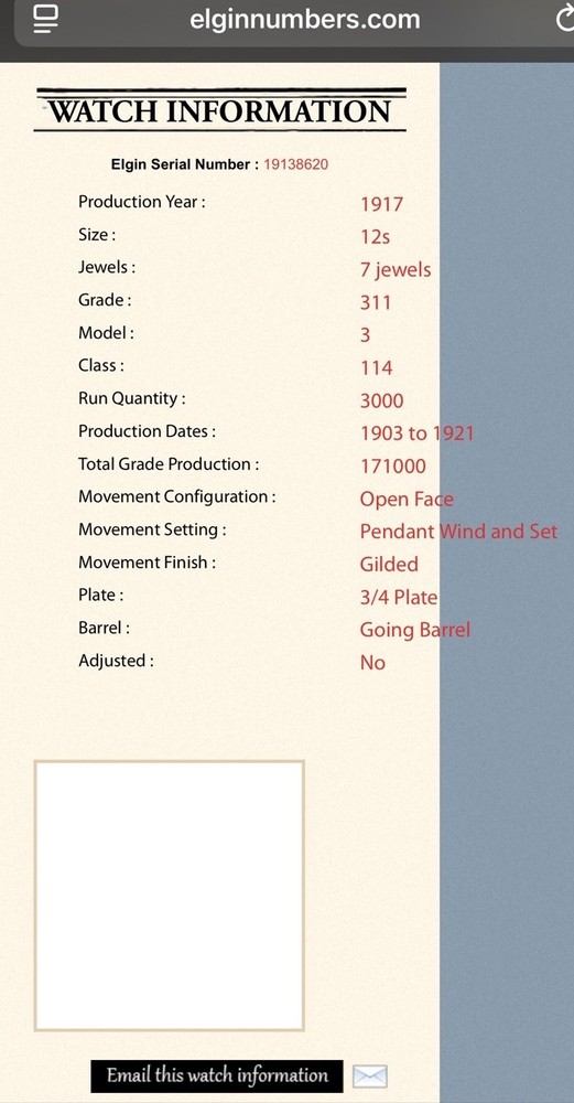 Vintage 1917 Elgin 12s pocket watch, grade 311 Model 3 - this info taken by looking up serial number! See pic of screenshot from Elgin website with details! Case size diameter is 44mm! Please use your judgement as to type, size, condition and age as I know nothing other than what the screenshot says!! Second hand runs! However the minute and hour hand will not advance on their own. They can be moved when setting time! For parts or repair! Open Face/golden guilded 7J Movement! Winds up and second hand takes off! There are hairlines in the porcelain! Both caseback and bezel screw off and on to remove and put back on! As is as seen as pictured… Please read below: Please review item specifics, and pictures for best details!! Please ask questions and good luck bidding! If any issue with purchase or arrival condition such as not as described, please reach out to me before posting feedback and or opening a case and I will make it right!! My wish is for you to have a happy buying experience and to enjoy my items!! Please note about vintage items. Unless marked new or new old stock, they are sold in used, as-is, pre-owned condition. Because of the age of these items they may have some wear, imperfections and signs of use, age and time… "International buyers " please note: Import duties, taxes, and charges aren't included in the item price or postage cost. These charges are the buyer's responsibility. “Please check with your country's customs office to determine what these additional costs will be, prior to bidding or buying." Shipping international via the eBay international Shipping method! ** Due to the nature of used/vintage watches, I do not guarantee long term functionality and accuracy... for best performance always have older watches serviced!! ** In regard to water resistance and or waterproof: the water resistance rating, if any, is based on the manufacturer's marking, not an actual test by me. I do not recommend using any of my used watches in submerged water environment such as swimming or shower or ocean!