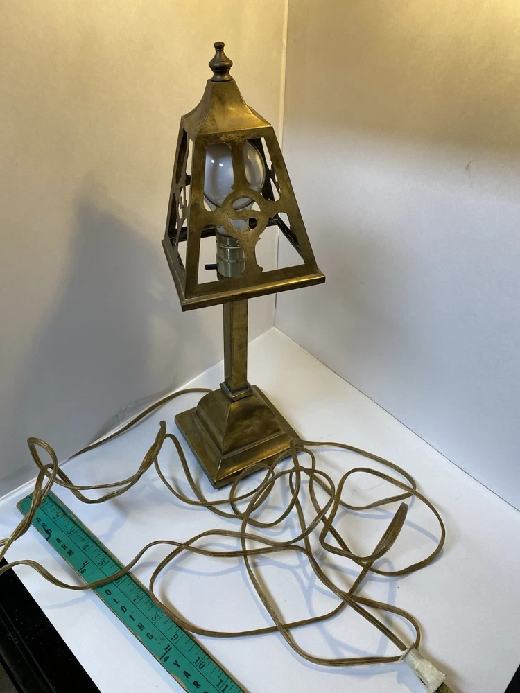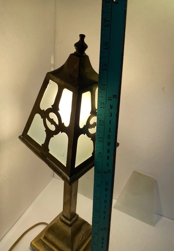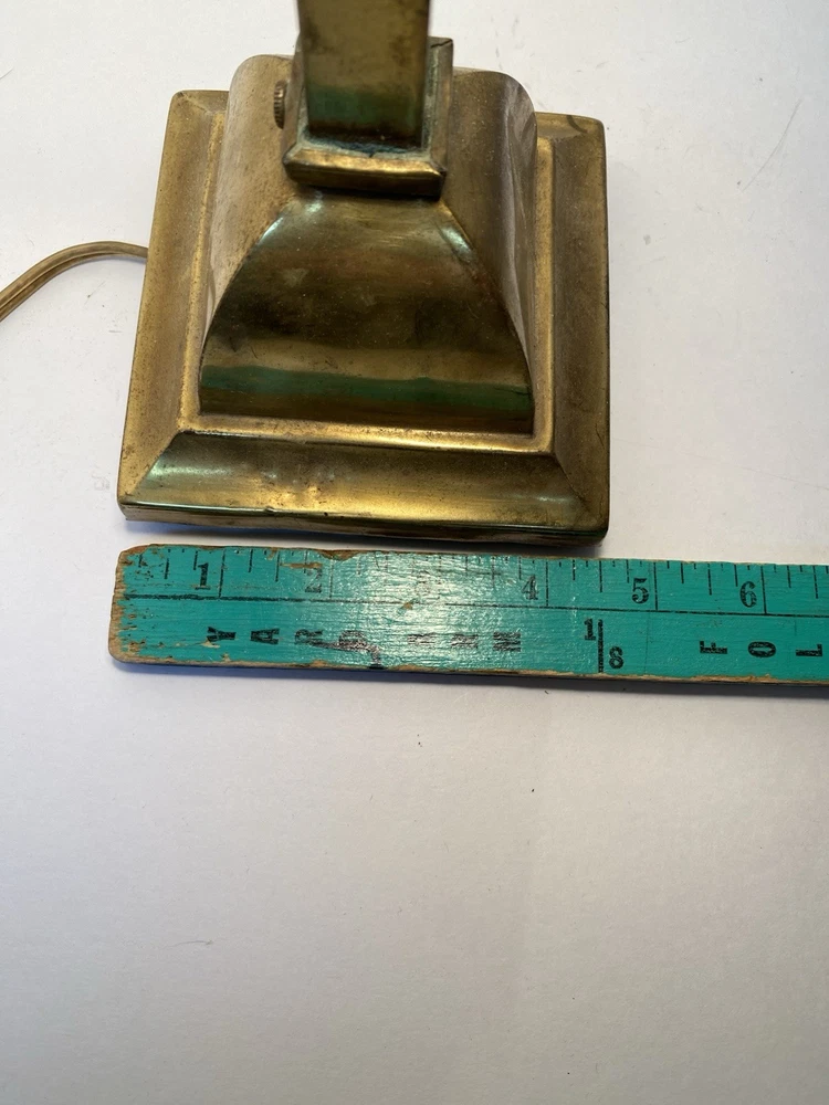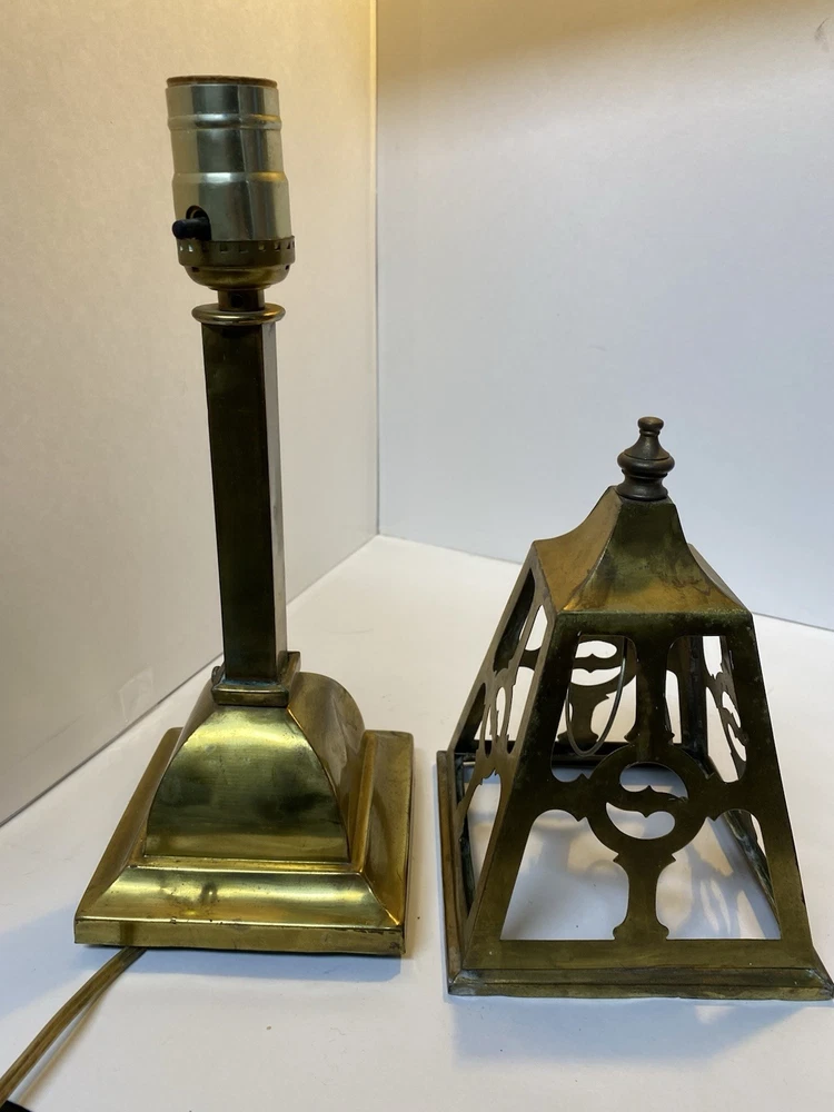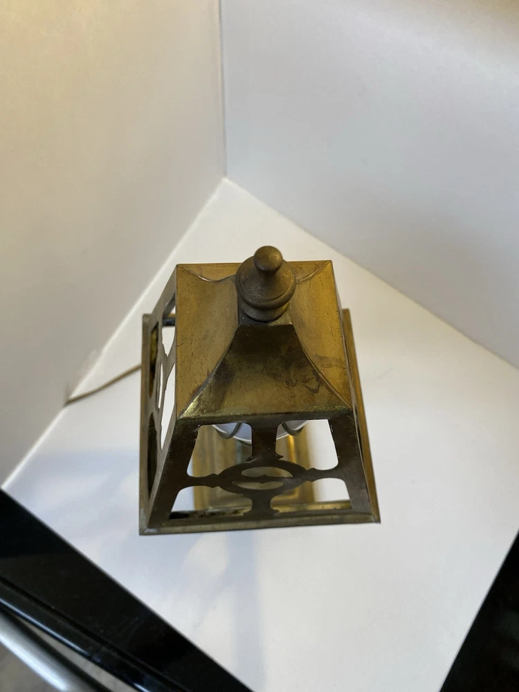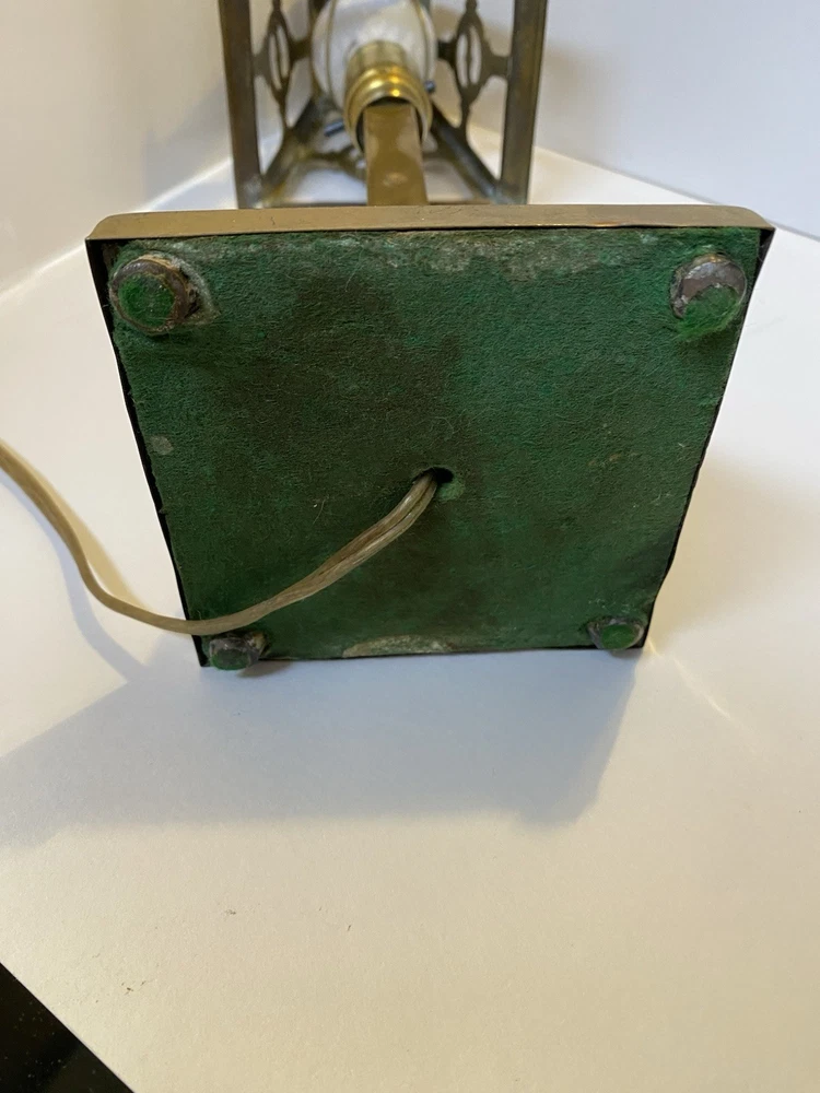 Antique Brass & Slag glass Shade- 5” square and 4.5” lamp base 16.5” total height. Really long cord. Maybe 15ft. Has not been rewired but it is recommended. 4 white glass inserts for the shade. - There is some chipping around the edges. It doesn’t show, it’s on the inside. Please look at the photos for a better description. The lamp base has some dents that are also shown in the photos. The shade could use soldering on one corner- shown in photos. Sold AS IS. No returns please. Thanks for looking!! 😀 StruttonStuff