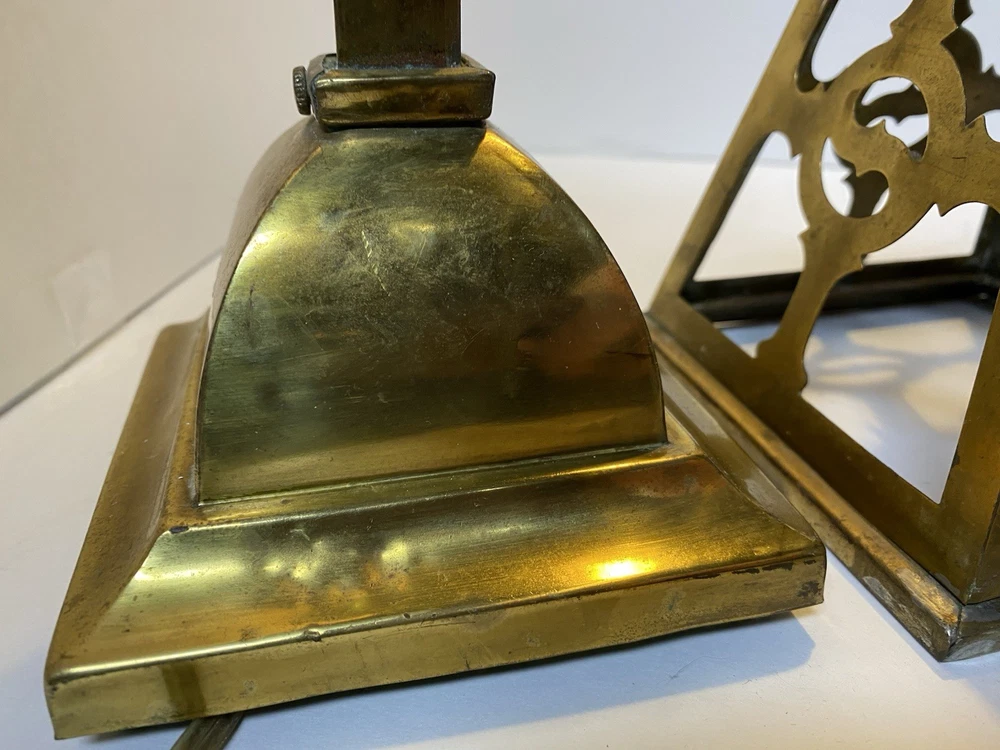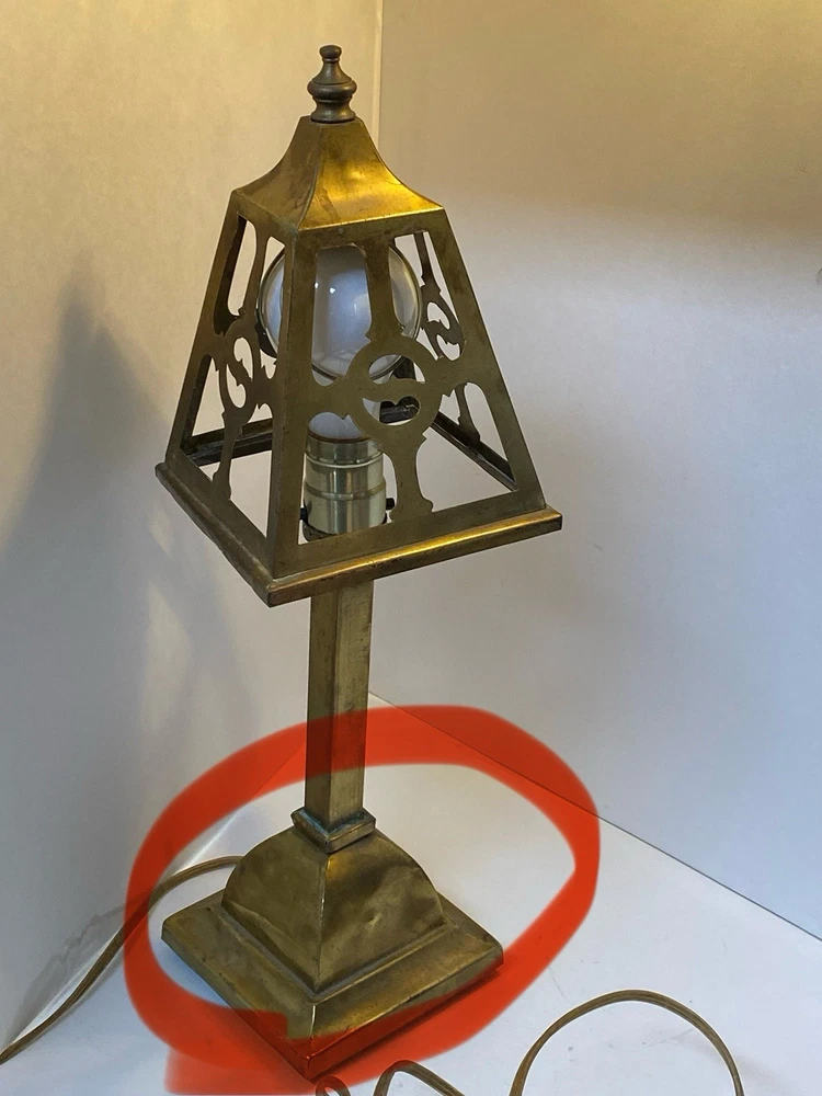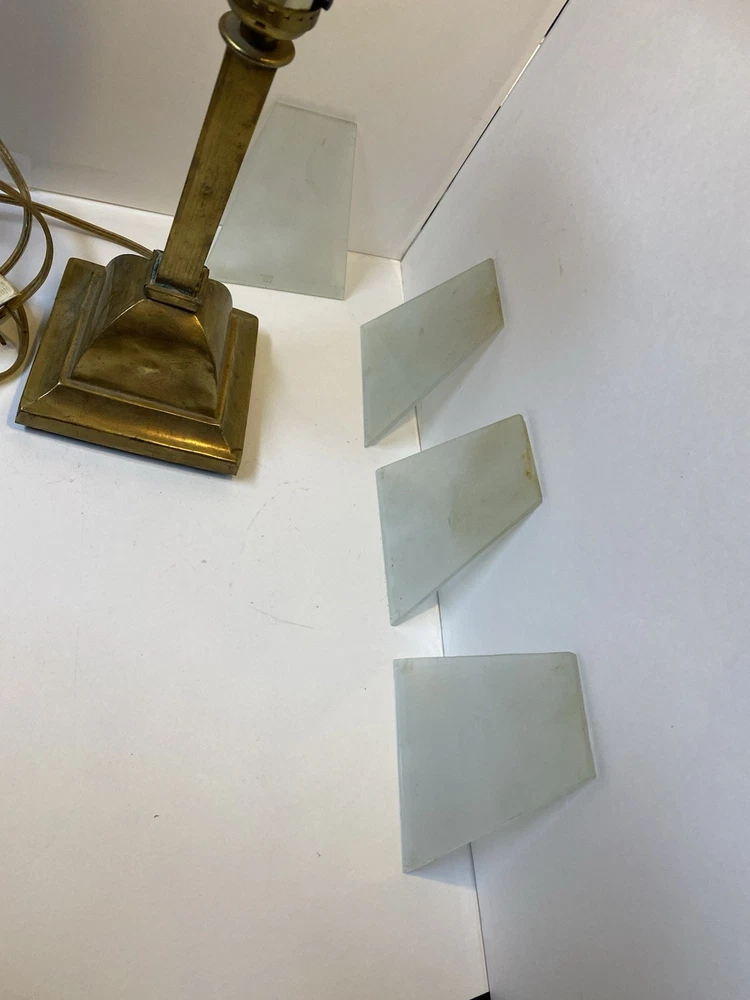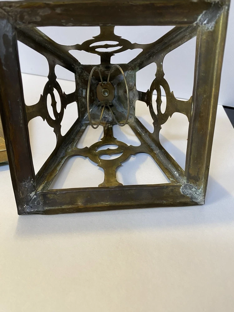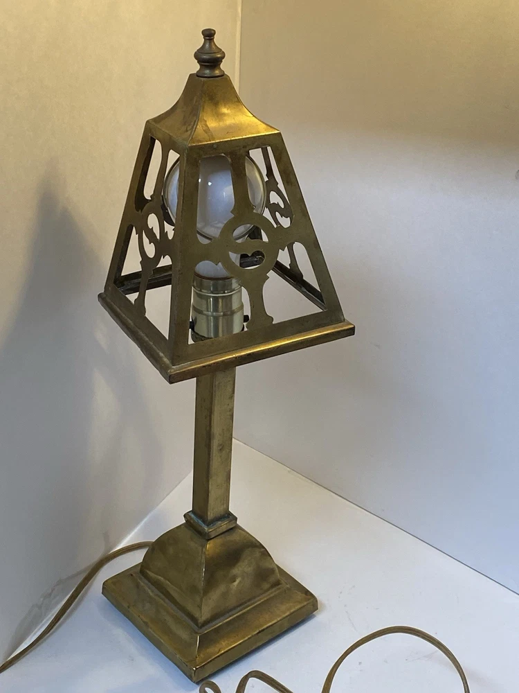 Antique Brass & Slag glass Shade- 5” square and 4.5” lamp base 16.5” total height. Really long cord. Maybe 15ft. Has not been rewired but it is recommended. 4 white glass inserts for the shade. - There is some chipping around the edges. It doesn’t show, it’s on the inside. Please look at the photos for a better description. The lamp base has some dents that are also shown in the photos. The shade could use soldering on one corner- shown in photos. Sold AS IS. No returns please. Thanks for looking!! 😀 StruttonStuff