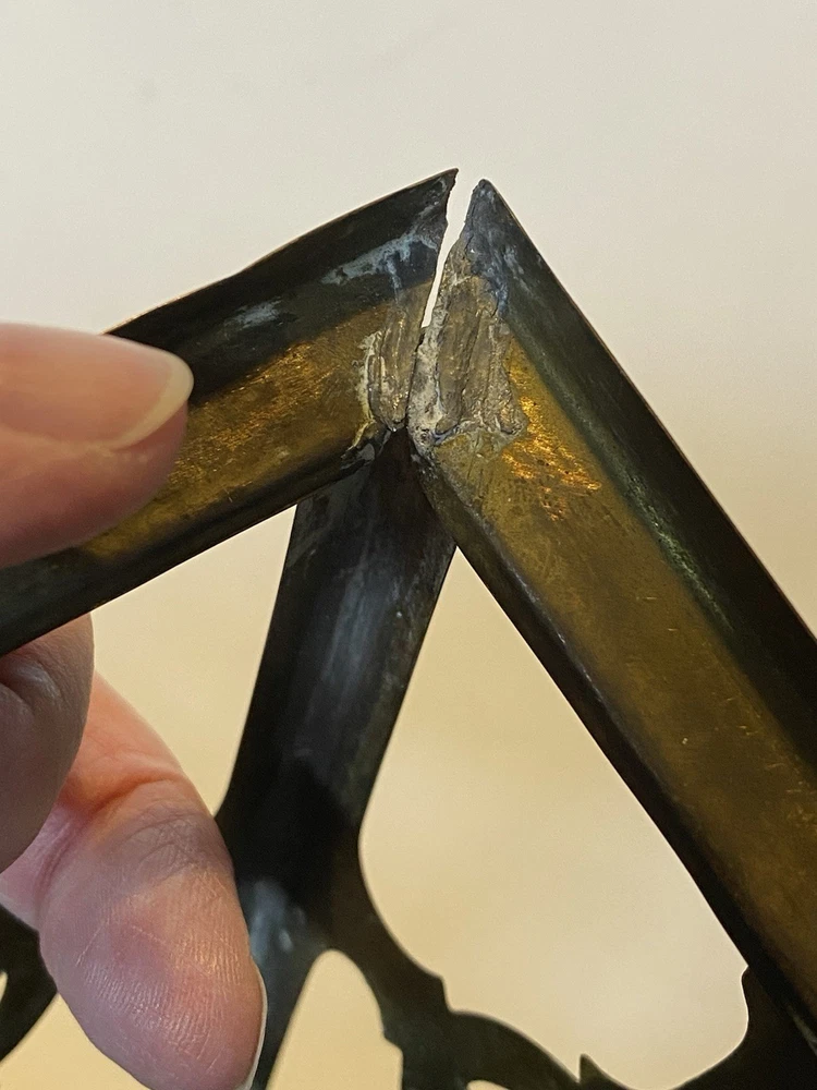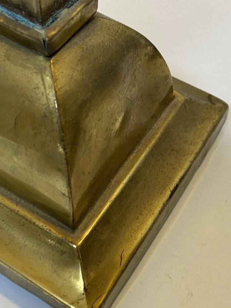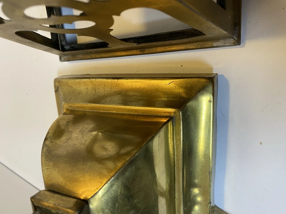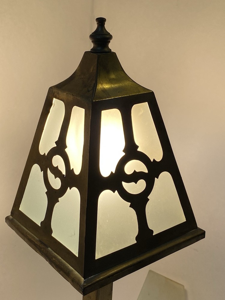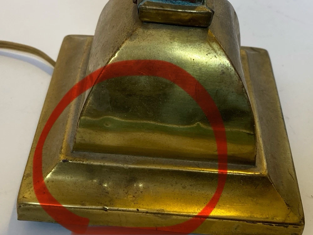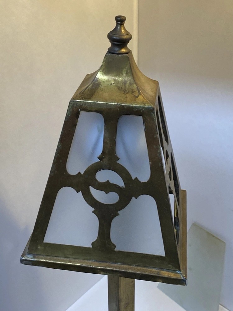 Antique Brass & Slag glass Shade- 5” square and 4.5” lamp base 16.5” total height. Really long cord. Maybe 15ft. Has not been rewired but it is recommended. 4 white glass inserts for the shade. - There is some chipping around the edges. It doesn’t show, it’s on the inside. Please look at the photos for a better description. The lamp base has some dents that are also shown in the photos. The shade could use soldering on one corner- shown in photos. Sold AS IS. No returns please. Thanks for looking!! 😀 StruttonStuff