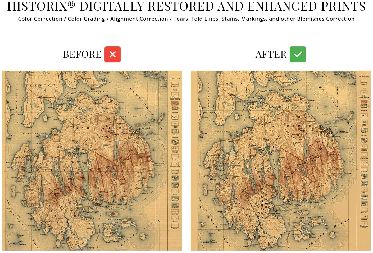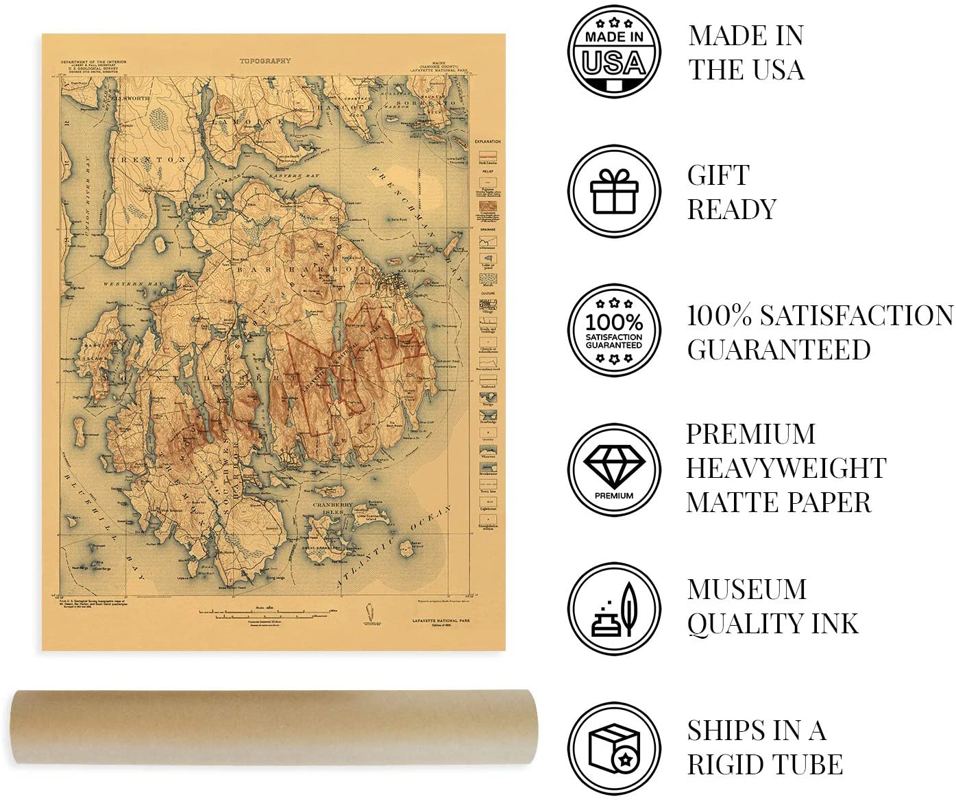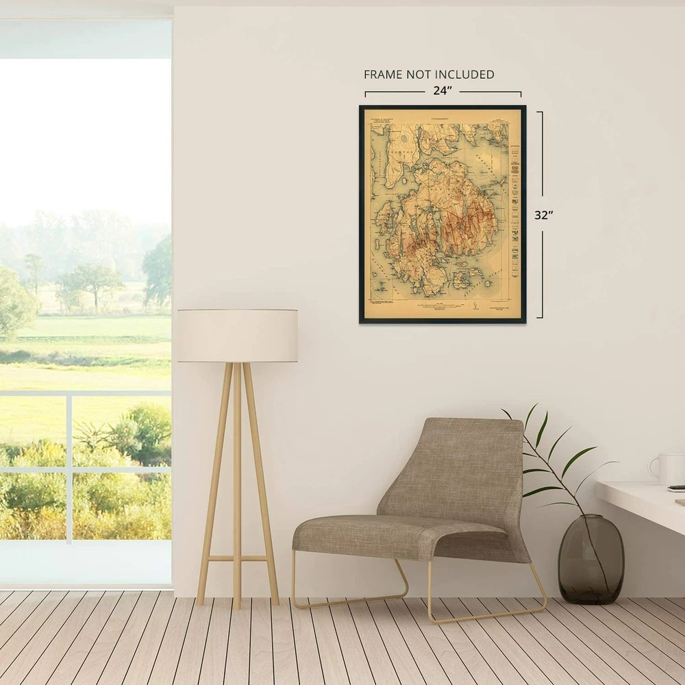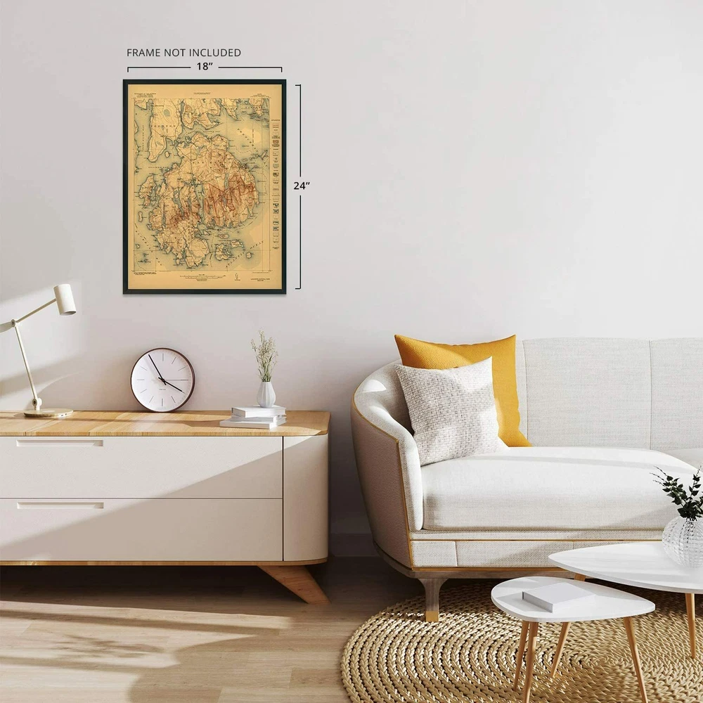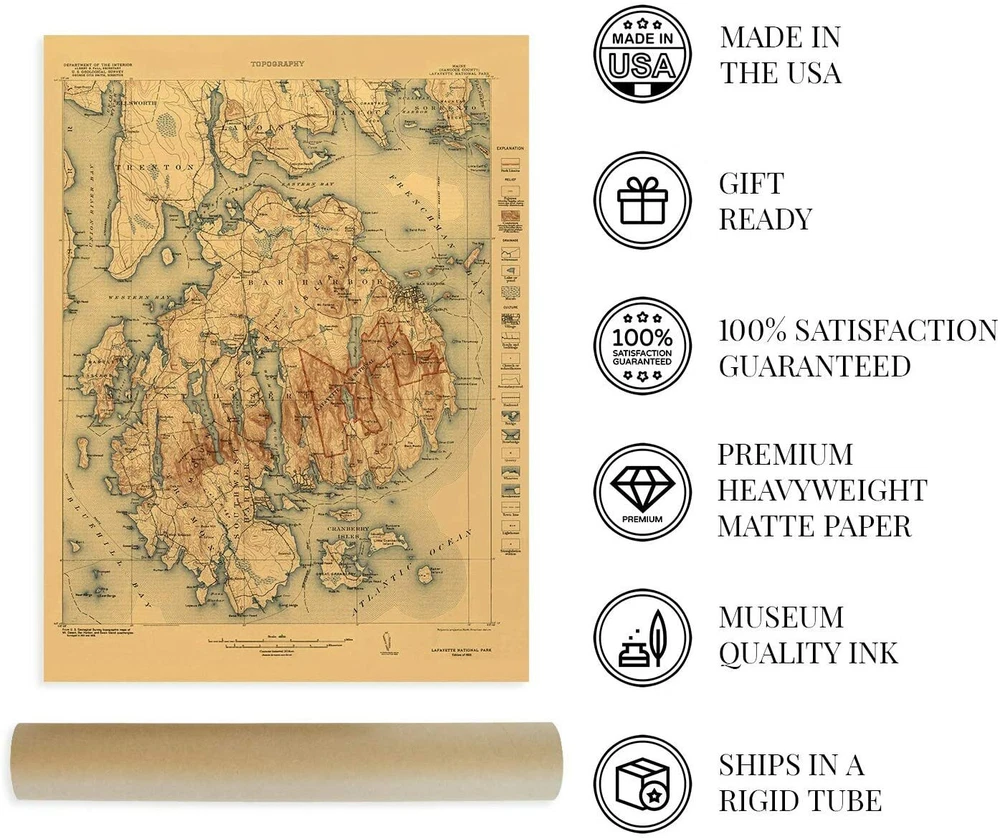 Feature Points VINTAGE MAP REPRODUCTION: You’ll love this high quality historic reproduction of 1922 Acadia National Park Map. Our museum quality maps are archival grade, which means it will look great and last without fading for over 100 years. Our print to order maps are made in the USA and each map is inspected for quality. This beautiful artwork is a perfect addition to your themed decor. Vintage maps look great in the home, study or office. They make a perfect gift as well. MUSEUM QUALITY: This high quality map print will be a great addition to your vintage-themed wall. Don't waste money on cheap-looking, thin paper posters. We use thick, fine art print quality matte paper. Our professional’s choice matte paper displays artwork in high detail without glare. The color is vibrant and the text is easy to read. When framed, this map looks absolutely stunning. A LOOK BACK AT HISTORY: This is an impressive, historic reproduction of 1922 Acadia National Park Map. This print is from an original found in the maps and geography division of the US Library of Congress. A true piece of history. See our product description section for more fascinating information about this historic map and its significance. READY TO FRAME: This print includes a 0.2 inch border for a perfect frame fit and look. Our maps are designed to fit easy-to-find standard frame sizes, saving you money from having to pay for a custom frame. Each map is inspected for quality and shipped in a rigid tube. HISTORIX: We love history and art. Sometimes old maps have tears, folds, separations and other blemishes. We digitally restore and enhance maps while keeping its historical character. All our maps are proudly made in the USA. Customers all over the world love our vintage maps and we know you will too. Additional Information Published six years after its establishment as the first National Park east of the Mississippi River, this distinct depiction of the iconic Acadia National Park immediately transports the viewer back in time. Originally named Sieur de Monts in 1916, then Lafayette National Park in 1919, it would be renamed Acadia in 1929 to honor the original French colony that had inhabited the island as well as much of Maine. Philanthropist and Industrialist John D. Rockefeller was responsible for much of the development throughout the park and had been one of the so-called Cottagers who built luxurious estates on the island in the late 19th century. Before that period, the late 1870s had found a number of artists and journalists discovering the untouched beauty and nature of the region, including prominent members of the Hudson Schools. By the 1880s, approximately thirty hotels were operating, and the cool summers and relaxing pace were attracting tourists from throughout the region. As this tourism grew, so did wealthy visitors who expanded the development of the area with large estates and lavish parties throughout the summers. Landscape Architect Charles Eliot is credited with the idea of establishing the park. One of the most unique features of the park is that much of it was created through private funding and not federally approved funds with the exception of the carriage roads, which were constructed in the 1930s by the Civilian Conversation Corps. The distinctive aesthetic and tremendous amount of detail contained on this map immediately transports the viewer back in time, and this is truly an authentic piece of cartographical history. Our museum quality giclee Acadia map print comes printed with archival ink on premium heavyweight matte paper. This eye-catching Acadia Park vintage map reproduction print makes the perfect gift for anyone that loves history and imagery.