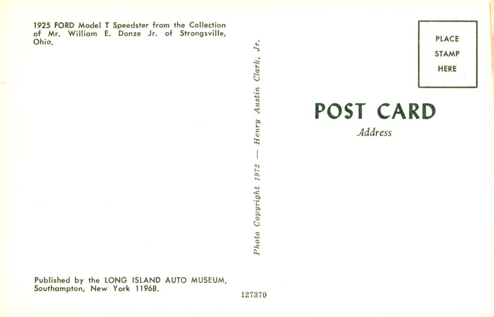 MAKE AN OFFER. THE MORE YOU BUY THE BETTER DEAL I WILL ACCEPT This postcard features a 1925 Ford Model T Speedster from the collection of Mr. William E. Donze Jr. of Strongsville, Ohio, published by the Long Island Auto Museum in Southampton, New York.
