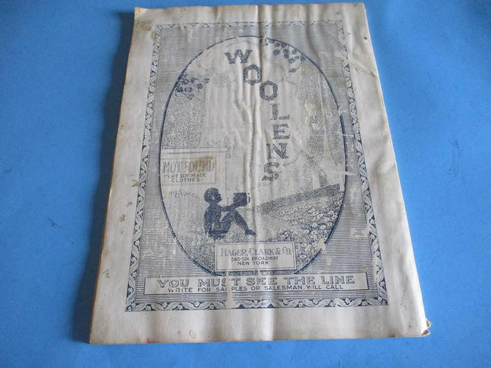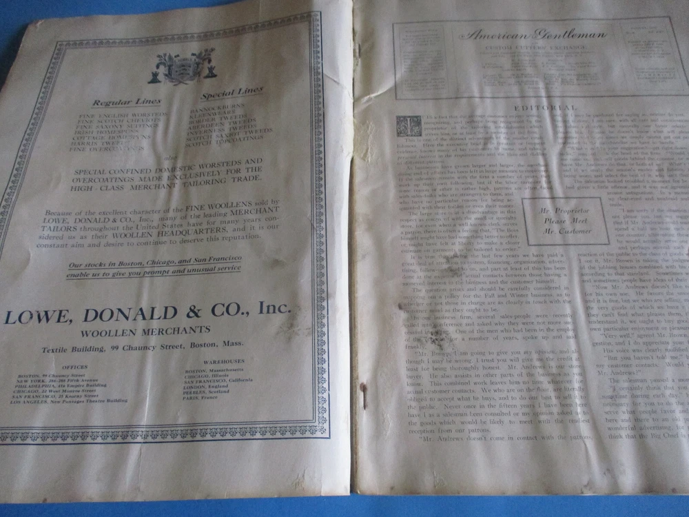 ANTIQUE AMERICAN GENTLEMAN FASHION JOURNAL OF THE CUSTOM TAILORING TRADE DATED 1925 PUBLISHED BY AMERICAN FASHION CO., NEW YORK CITY, N.Y., U.S.A. IT MEASURES 14" LONG & 10" WIDE COVER ON FRONT HAS A FEW SMALL TEARS & SMUDGING; BACK COVER GOT WET AND SOME PAGES ARE STICKING TOGETHER; 68 PAGES ARE IN PRETTY FAIR CONDITION - BUYING "AS FOUND" NO RETURNS WE SHIP QUICKLY!!