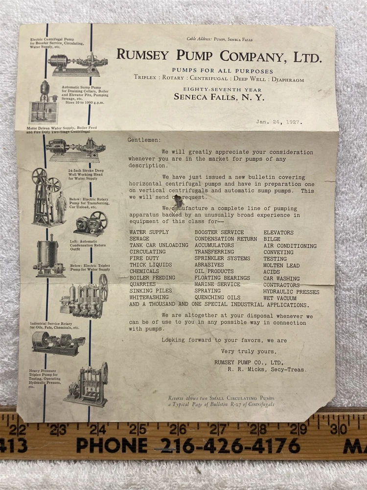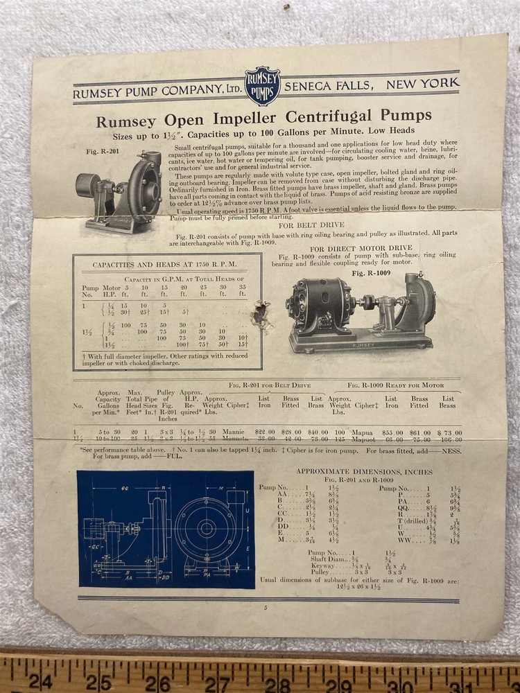 Original: 1927 Rumsey Pump Company LTD Seneca Falls NY Information Sheet. Please see the photographs for a detailed description as it will show most blemishes that the item has. Free shipping to all US addresses. Please note, my schedule only allows me to ship once a week (Usually close orders out at 5PM on Tuesdays and ship Wednesday Mornings), If you buy on Wednesday, it most likely not ship until the following Wednesday. It can take up to 5 business days for your item to ship, or it can ship the next day if you purchase on a Tuesday. I apologize in advance, and I beg for your patience, being on the road allows me to find these few and far between items. Please let me know if you need it by a deadline for a birthday or something and I'll see what I can do. For international buyers, please inquire about shipping if the shipping is showing above $24, the prices listed are default 4lbs priority and most likely is way above what it actually costs to ship. Powered by SixBit's eCommerce Solution