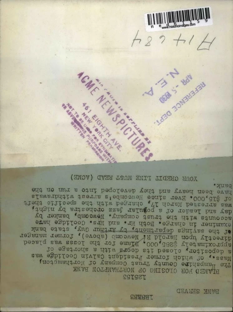 ebay template Note: Please study the images carefully to determine the condition of this vintage photograph, as it may not be in perfect condition. It may contain wrinkles, cracks, and possibly even tears due to its age and how it was handled before it got to us. A scanner may interpret colors and contrast differently than human eyes will, so it is possible that the actual photograph may be slightly darker or lighter in person. This vintage photograph is offered for sale as a collectible item and conveys no transfer of copyright. 1930 Press Photo Harold R Newcomb charges with Theft on Northampton Bank. This is an original press photo. Former Manager of the Savings DepartmentPhoto measures 6 x 8inches. Photo is dated 04-05-1930. PHOTO FRONT PHOTO BACK Historic Images Part Number: ned61159 Sell Smarter with Kyozou. Inventory and Ecommerce Management