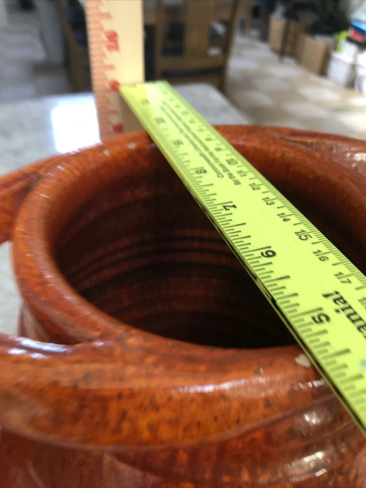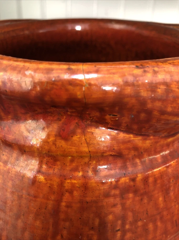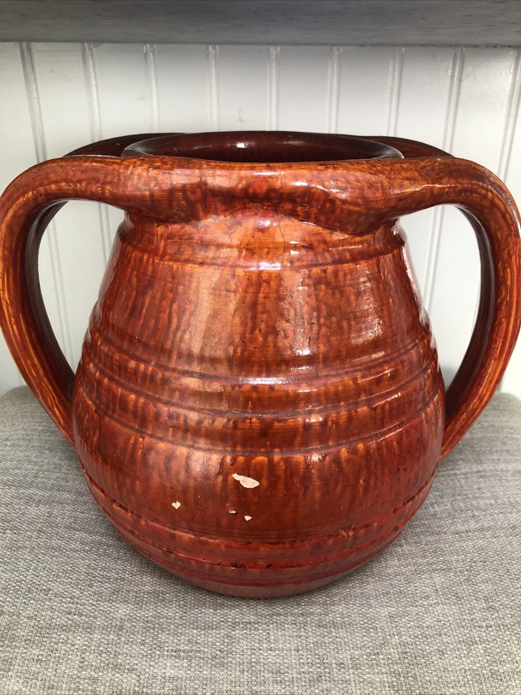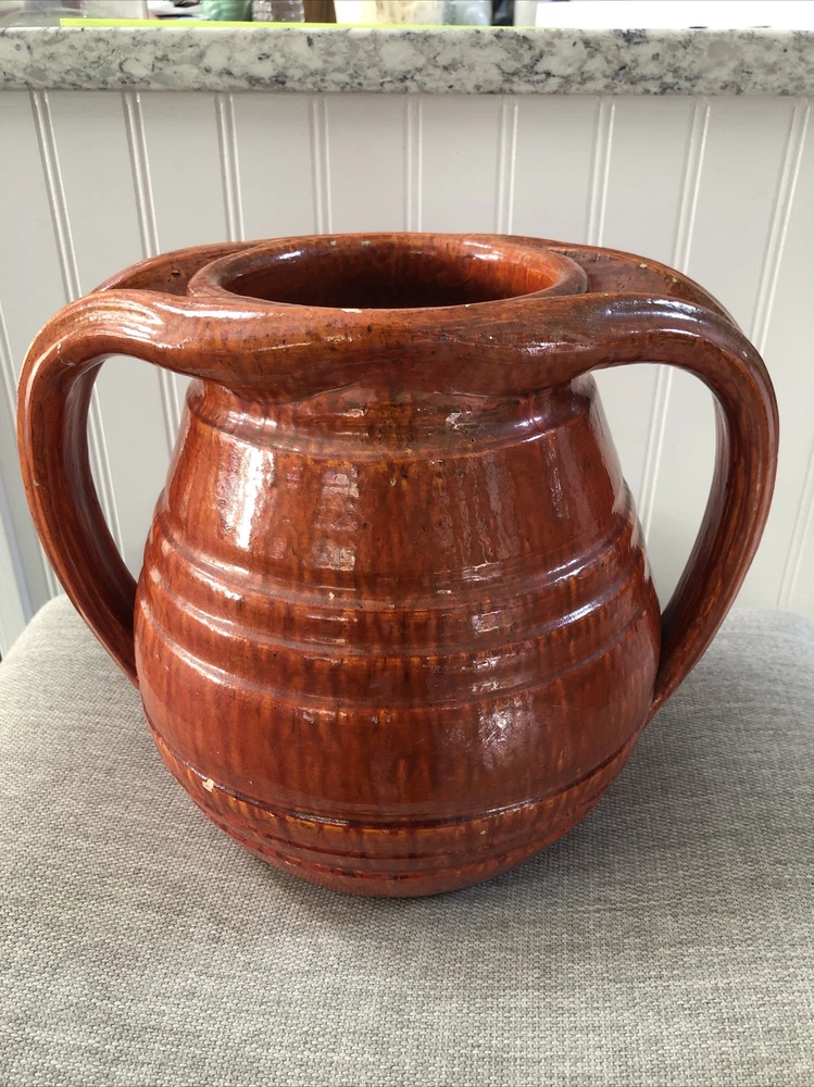 This 1930s North Carolina Cole Pottery apothecary jar/jug is a stunning addition to any collection. With a vibrant red/deep orange drip glaze and double-handled design, it is both functional and decorative. The jug measures 11 inches high and 11.5 inches wide at the handles. It has concentric runs incised horizontally around the body and unique split strap like handles It has one old tight hairline about 2.5 inches long at the rim that looks to possibly be a production or kiln flaw rather than a crack from damage or misuse. Please see photos where I’ve tried to show this. There is one shallow flake off the bottom edge and a few lighter colored spots where the glaze has popped which can be typical of this older folk pottery. This piece is a must-have for any North Carolina pottery collector +++++++++++++++++++++++++ We respectfully ask for payment within 3 days of auction close/end. The items will be carefully packed and shipped within 3 business days of confirmed payment. PLEASE NOTE: IF THE CALCULATED SHIPPING SEEMS HIGH, PLEASE MESSAGE US WITH YOUR ZIP CODE AND WE CAN PROVIDE AN EXACT QUOTE -- WE’RE LOCATED IN NEW ENGLAND SO BUYERS FROM HIGHER ZIP CODES MAY SEE VERY HIGH SHIPPING RATES VIA THE CALCULATOR. MORE THAN HAPPY TO DOUBLE CHECK SHIPPING RATE, SO DO NOT HESITATE TO ASK. Will refund postage if paid is more than .50 over actual We strive to inspect, describe, and photograph my items carefully and accurately. We are knowledgable but not experts or collectors. If you need more information, please ask. International buyers: We do not accept international returns under any circumstances. If you are unhappy with an item, please contact us so we can work something out, other than a return. Thanks for your understanding Shipping charges keep increasing and while we are happy to provide free expert packing labor and materials, we can't help with the cost of shipping. Also, International buyers, please be aware that you may have to pay import tax or customs fees upon delivery. We do not misrepresent the purchase price of items on packing slips. Buyer/winning bidder is responsible for actual shipping We pack with extreme care, but If the item arrives damaged in transit, please take a photo of the item AND the packaging and send it to us immediately. This is necessary for us to complete the paperwork for you in order to issue a full refund