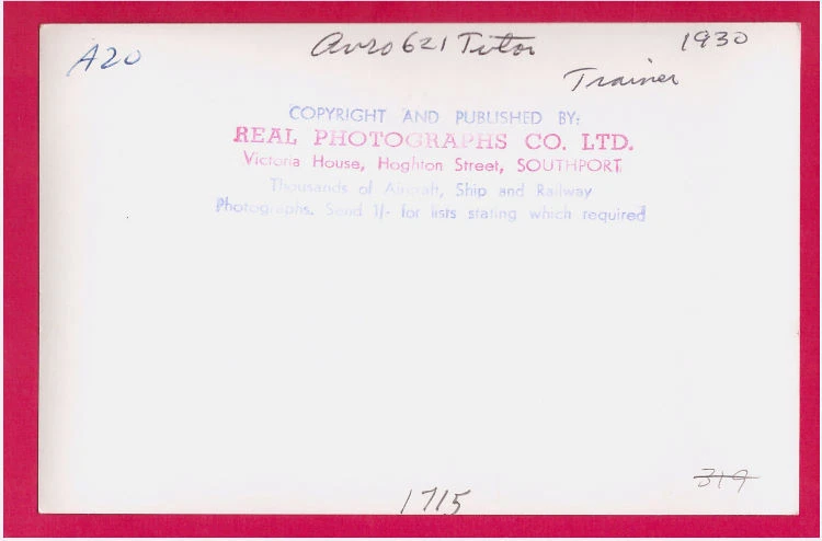 201312-08-1715-NKY Visit my store for thousands of historical photos! Item Description Grading Standard: Vintage Real-Photo by Real Photograph Co. Ltd Size: 3.5x5.5 inches (paper size) with some minor variation Blacklight Test: No. Other Notes: Nice commercial photo. (Wikipedia) - A.V. Roe's Type 621 Tutor was a two-seat British radial-engined biplane from the interwar period. It was a simple but rugged initial trainer that was used by the Royal Air Force as well as many other air arms worldwide. Do not expect perfect photos. Often old photos have small creases and tears around the edges. Real Photograph Co. Ltd. was a British company and to my knowledge it went out of business in the later part of the 1960s. Note the hand writing on the back of the photograph. Special Note: None. Additional Information International Purchasers: Import duties, taxes and charges are not included in the item price or shipping charges. These charges are the buyer's responsibility. Please check with your country's customs office to determine what these additional costs will be prior to bidding/buying. We do not mark merchandise values below value or mark items as "gifts" - US and International government regulations prohibit such behavior. The "value" on the customs form is the purchase price. N/A N/A Photo Grading Standards and Terms Used News Agency Photos: Wire Photos or News Agency Photos were extensively used in print media during the first half of the 1900's. Issued by news agencies (such as Acme, NEA, International News, Associated Press, UPI, Fotogram, Keystone,) only to the press, these Gorgeous pieces capture a historical moment, frozen in time, as they were issued on the day the event happened. Unfortunately they were issued in extremely limited quantities solely for print media industry usage (it is estimated that there were approximately 25 - 50 of EACH particular photograph made). Over the years, many were destroyed or lost, and in some cases, there are only 1 or 2 specimens known to exist today of a particular photograph making these Original! , First Generation Vintage Photographic relics Outstanding Investments. Wirephoto Telephoto Cablephoto Radiophoto Soundphoto This type of photo was an early form of electronic transmission. Some scratchiness in the image is normal. Please inspect the image carefully as the quality can vary greatly. They can range from atrocious to superb and everywhere in between. Also, this type of photo is not a original photo using the traditional definition since it was not developed but was normally printed on film stock. We consider these 1st Generation Original Photos. 1st Generation AKA Original: This is a photo manufactured near the time when the image was taken. News Agency and Official photos fall into this category automatically. Vintage: Photo that is at least 30 years old. Size: Size given is almost always the paper size of item and not image size. Image size is normally smaller.Metric conversion is 1 inch = 2.54 centimeters for our international customers. Guarantee and Standard Disclaimer Guarantee: See return policy in the shipping tab. Payment must be received within 10 calendar days of the auction closing or the item will be put up for sale. Visit my eBay store for thousands of historical photos and postcards! Powered by SixBit's eCommerce Solution