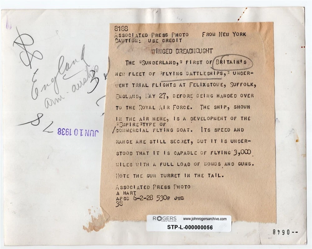 2022-01-0648 Visit my store for thousands of historical photos! Item Description Grading Standard: News Agency 1st Generation AKA Original Press Photo Size: 7x9 inches with minor variation Blacklight Test: No. Other Notes: Historical photograph. Do not expect perfect photos. Often old photos have small creases and tears around the edges. Scene Description: The Sunderland, first of Britain's new fleet of flying battleships, underwent trial flights at Felixstowe, Suffolk, England, May 27, before being handed over to the Royal Air Force. The ship, shown in the air here, is a development of the Empire type of commercial flying boat. Its speed and range are still secret, but it is understood that it is capable of flying 3,000 miles with a full load of bombs and guns. Note the gun turret in the tail. Published June 10, 1938. Note the incorrect year in the news caption. It is not "28" but should be "38". Additional Information International Purchasers: Import duties, taxes and charges are not included in the item price or shipping charges. These charges are the buyer's responsibility. Please check with your country's customs office to determine what these additional costs will be prior to bidding/buying. We do not mark merchandise values below value or mark items as "gifts" - US and International government regulations prohibit such behavior. The "value" on the customs form is the purchase price. N/A N/A Photo Grading Standards and Terms Used News Agency Photos: Wire Photos or News Agency Photos were extensively used in print media during the first half of the 1900's. Issued by news agencies (such as Acme, NEA, International News, Associated Press, UPI, Fotogram, Keystone,) only to the press, these Gorgeous pieces capture a historical moment, frozen in time, as they were issued on the day the event happened. Unfortunately they were issued in extremely limited quantities solely for print media industry usage (it is estimated that there were approximately 25 - 50 of EACH particular photograph made). Over the years, many were destroyed or lost, and in some cases, there are only 1 or 2 specimens known to exist today of a particular photograph making these Original! , First Generation Vintage Photographic relics Outstanding Investments. Wirephoto Telephoto Cablephoto Radiophoto Soundphoto This type of photo was an early form of electronic transmission. Some scratchiness in the image is normal. Please inspect the image carefully as the quality can vary greatly. They can range from atrocious to superb and everywhere in between. Also, this type of photo is not a original photo using the traditional definition since it was not developed but was normally printed on film stock. We consider these 1st Generation Original Photos. 1st Generation AKA Original: This is a photo manufactured near the time when the image was taken. News Agency and Official photos fall into this category automatically. Vintage: Photo that is at least 30 years old. Size: Size given is almost always the paper size of item and not image size. Image size is normally smaller.Metric conversion is 1 inch = 2.54 centimeters for our international customers. Guarantee and Standard Disclaimer Guarantee: See return policy in the shipping tab. Payment must be received within 10 calendar days of the auction closing or the item will be put up for sale. Visit my eBay store for thousands of historical photos and postcards! Powered by SixBit's eCommerce Solution