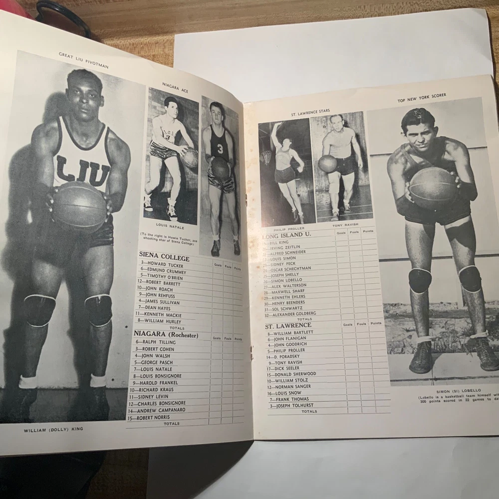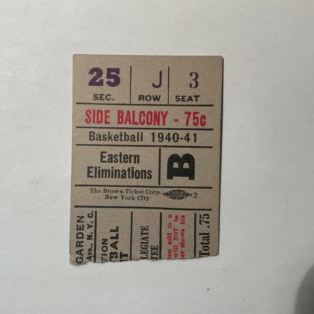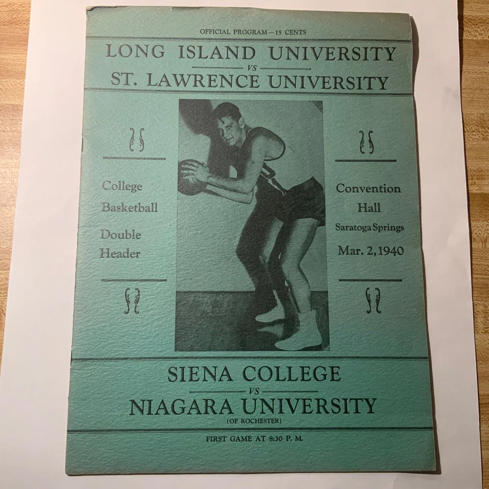 VG - EX. Lot of three items (2 ticket stubs + 1 program) pertaining to Long Island University’s championship basketball run under Hall of Fame coach Clair Bee from 1939 - 1941. The 1938-39 LIU team went undefeated (23 - 0) and then swept through the NIT to become National Champions. The 1939-40 team went 19 - 4 during the regular season, but were defeated by DePaul in the NIT. Finally, in 1940-41 LIU went 25 - 2 and once again swept through the NIT field to claim their second National Championship in three years. The package includes: 1. 12/30/1938 ticket stub - Madison Square Garden - regular season game Long Island U. Vs. USC. 2. 3/2/1940 - Program from double-header at Saratoga Springs, NY - Long Island vs. St. Lawrence / Niagara vs. Sienna. Large 16 page (including covers) program. 3. 1941 NIT ticket stub (unsure of exact date) Eastern Elimination games. Long Island U. Was the eventual champion of the eight team field, which also included Ohio, Seton Hall and CCNY as semi-finalists.