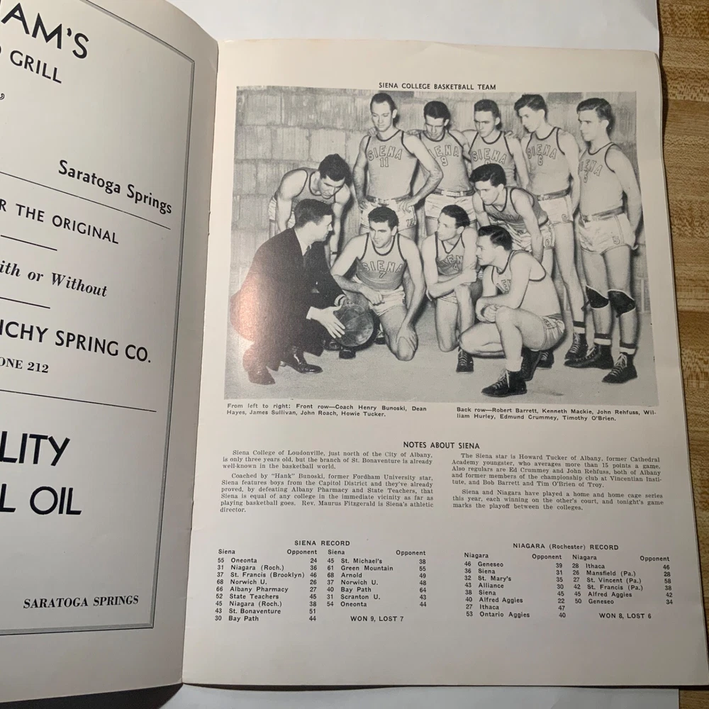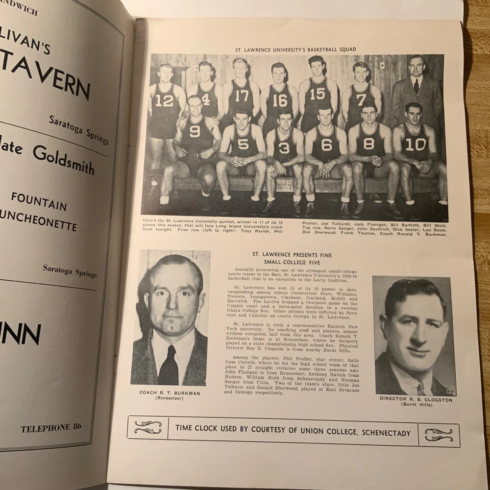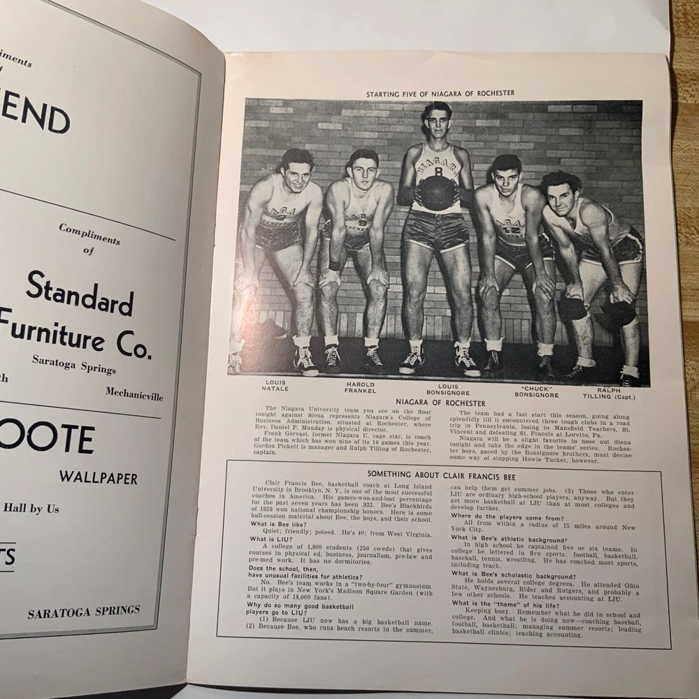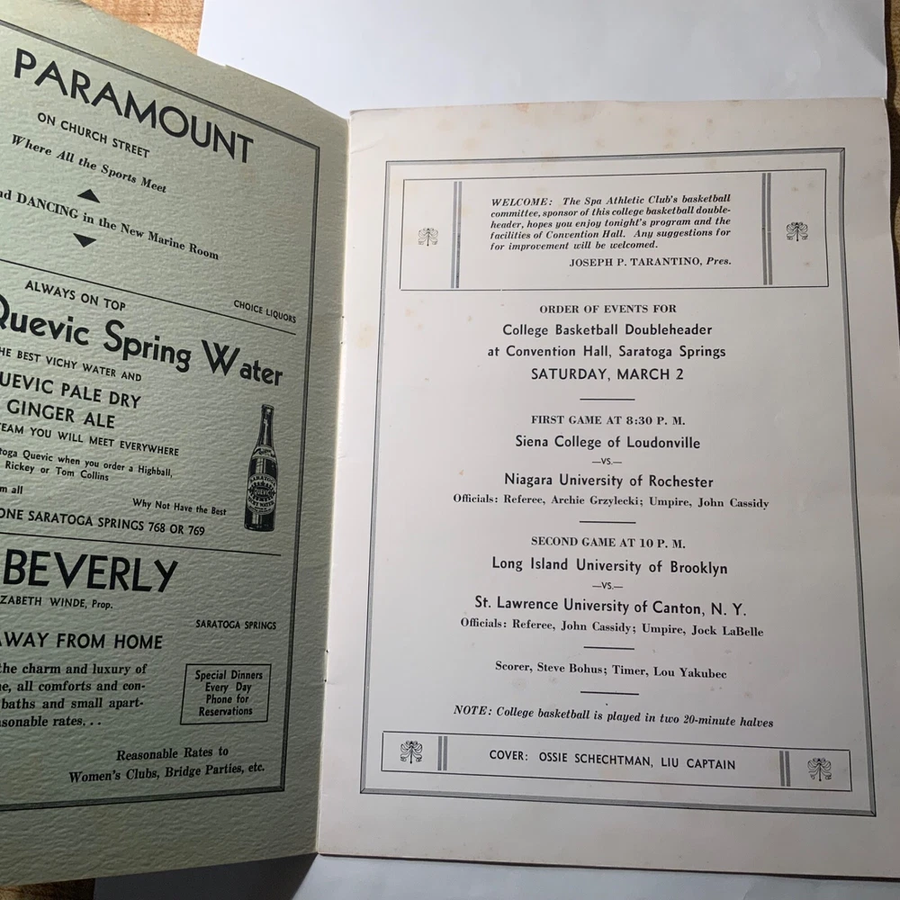 VG - EX. Lot of three items (2 ticket stubs + 1 program) pertaining to Long Island University’s championship basketball run under Hall of Fame coach Clair Bee from 1939 - 1941. The 1938-39 LIU team went undefeated (23 - 0) and then swept through the NIT to become National Champions. The 1939-40 team went 19 - 4 during the regular season, but were defeated by DePaul in the NIT. Finally, in 1940-41 LIU went 25 - 2 and once again swept through the NIT field to claim their second National Championship in three years. The package includes: 1. 12/30/1938 ticket stub - Madison Square Garden - regular season game Long Island U. Vs. USC. 2. 3/2/1940 - Program from double-header at Saratoga Springs, NY - Long Island vs. St. Lawrence / Niagara vs. Sienna. Large 16 page (including covers) program. 3. 1941 NIT ticket stub (unsure of exact date) Eastern Elimination games. Long Island U. Was the eventual champion of the eight team field, which also included Ohio, Seton Hall and CCNY as semi-finalists.