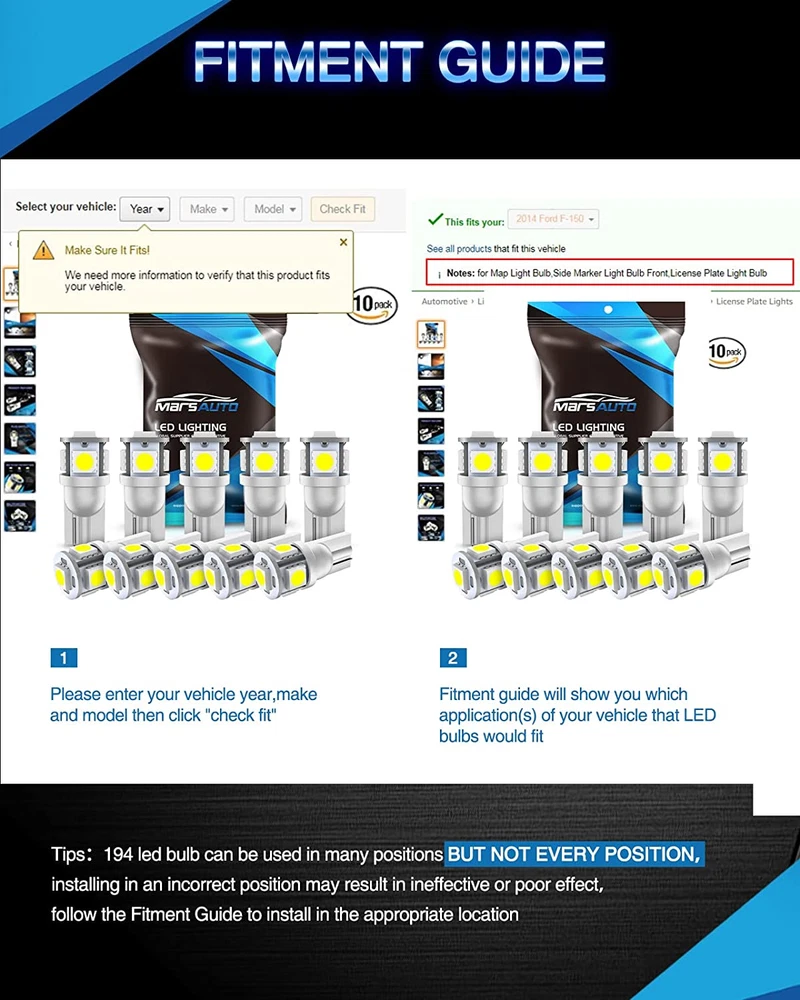Neighborhood service 194 LED Bulb 6000K White 168 T10 2825 W5W 5SMD Replacement Bulbs for Car Dome Map Door Courtesy Side Marker Reading Glove Box License Plate Lights (Pack of 10) ENJOY THE FEATURES Fit bulb size: T10, 147, 152, 158, 159, 161, 168, 175, 184, 192, 193, 194, 2825, W5W, 194 LED bulb can fit map light, dome light, license plate light, trunk light, courtesy light, side marker light, interior door light, parking light Notice: 194 led bulbs could fit most of positions of car, do not fit all positions of your car, according to the year and model of your car, please double check owner's manual, for 12V vehicle Better beam pattern: each bulb has 5 pcs high power SMD led, color temperature: 6000K(xenon white), voltage: 12V No polarity no flip: it is truly no polarity, can light on two sides, no need more modification or flip, plug and play, easy install within 5 minutes Tips: 10 packs of 194 led bulbs of one set, for some vehicles, It may need a canbus decoder to fix flickering or error code Product Description 1 BRIGHTER BULBS 2 LONGER LIFESPAN 3 EASIER TO INSTALL What is the cross reference number for this product? This product will fit OEM bulb's part number: 194 168 2825 W5W T10 175 etc. How many bulbs included per order? Yes, it includes 10pcs 194 LED bulbs per order; Color will be based on your selection. Can I find the correct products for my vehicle directly on Amazon? Sure, Amazon has fitment Guide shows like amazonconfirmedFit | Make sure this fits. Please follow the instructions and checked the Notes and Position to see whether it meets your need. How to contact with seller if there are any issues with bulbs? Clicking "listing Page" --> Product Description-->Product guides and documents--> Clicking“User Guide (PDF)” --> Contact the "Marsauto Support Team" via the Brand email, usually you'll receive a reply within 24 hrs. What is the return policy? Hassel free return for 30 days since purchase date. Marsauto 2024 New Series LED Light Bulbs Add to Cart Add to Cart Add to Cart Add to Cart Add to Cart Add to Cart Add to Cart Customer Reviews 4.5 out of 5 stars 49,458 4.5 out of 5 stars 5,179 4.2 out of 5 stars 16 4.2 out of 5 stars 35 4.6 out of 5 stars 92 4.1 out of 5 stars 84 4.6 out of 5 stars 92 Price $11.09 $ 11 . 09 $13.99 $ 13 . 99 $16.99 $ 16 . 99 $19.99 $ 19 . 99 $18.99 $ 18 . 99 $19.99 $ 19 . 99 $19.99 $ 19 . 99 Pcs per Pack 10 pcs 4 pcs 2 pcs 2 pcs 2 pcs 2 pcs 2 pcs Color White White White White White White White Chip Model 3030-SMD 3030-SMD 2835-SMD 2835-SMD 2835-SMD 3030-SMD 3030-SMD Lumens 1500 LM 1500 LM 2000 LM 2000 LM 2000 LM 2000 LM 2000 LM No polarity ✔ ✔ ✔ ✔ ✔ ✔ ✔ Item model number T10 Item Package Quantity 1 Style 194 Light Source Type LED Color Temperature 6000 Kelvin Color Xenon White Mirror Lighting Type automotive-interior-dome-light-bulbs, automotive-exterior-combination-parking-and-side-marker-light-bulbs,Automotive-exterior-turn-signal-light-bulbs, Automotive-exterior-back-up-light-bulbs,Automotive-interior-dome-light-bulbs, automotive-exterior-license-plate-light-bulbs Product Dimensions 5 x 5 x 14 inches Wattage 5 watts Fit Type Vehicle Specific Fit Country of Origin China Manufacturer Part Number AT10-10P-W Specific Uses For Product function(f) {var _np=(window.P._namespace("DetailPageProductOverviewTemplatesJava"));if(_np.guardFatal){_np.guardFatal(f)(_np);}else{f(_np);}}(function(P) { P.when('A').execute(function(A){ A.on('a:truncate:po-attribute-truncate-1:updated', function(data) { var isTruncated = !data.truncateInstance.getIfTextFits(); var seeMoreElement = document.getElementById('po-attribute-see-more-id-1'); if(seeMoreElement) { seeMoreElement.style.display = isTruncated ? '' : 'none'; } }) }); })); map light, dome light, license plate light, trunk light, courtesy light, side marker light, parking light, interior door light, reading lights, glove box lights, inner tail light bulb, etc See more Item Weight 0.64 ounces Voltage 12 Volts Exterior Polished Auto Part Position Rear Model 194 T10 168 Is Discontinued By Manufacturer No 5.0 inches x 5.0 inches x 14.0 inches. Weight: 0.64 oz PAYMENT We accept all payments via Ebay using Credit Cards , PAYPAL , Apple Pay and many others SHIPPING We are always working hard to ensure your package arrives as soon as possible. Please understand that some factors like weather, high postal traffic, and the performance of shipping companies are outside of our control. We offer free shipping to the lower 48 states and ship within 3-5 business days of payment, usually sooner. We do not accept P.O. Boxes. Please provide a physical address. We do not ship internationally at this time. DELIVERY & RETURN POLICY We do not offer returns unless the item violates eBay policies. Please be aware these polices only make sellers accept returns if the item violates eBay's Buyer Guarantee. If you would like to learn more about this please visit eBay's Help Page. Thank you for your business