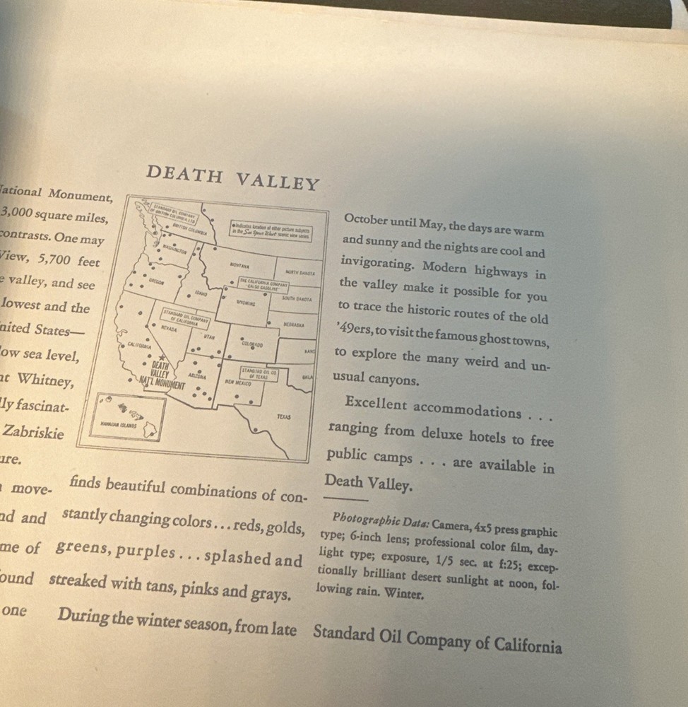The product is a single print of 1940s "See Your West" concept prints featuring 7x9 pic of Death Valley and points of interest in the west. This ephemera prin showcase different aspects of nature you would see by car during that era. Perfect for collectors interested in nature, cars, traveling and Americana. this print offers a unique glimpse into the past and provide a visual narrative of the era.
