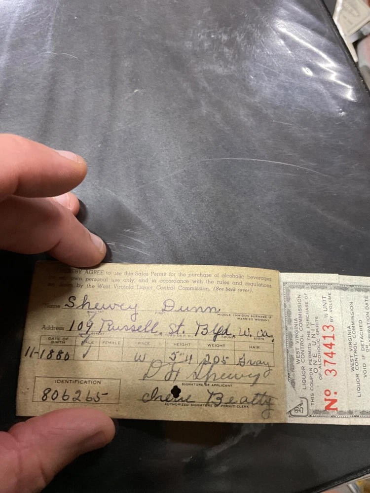 1940's State Of West Virginia-Liquor Sales Permit-No. 374413 BLUFIELD WV