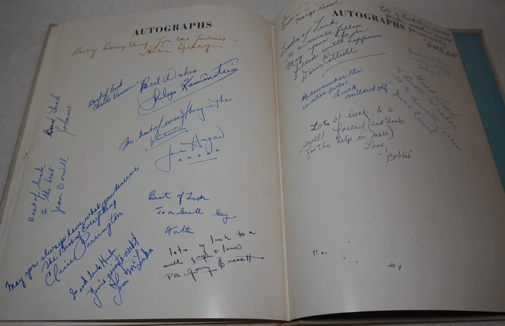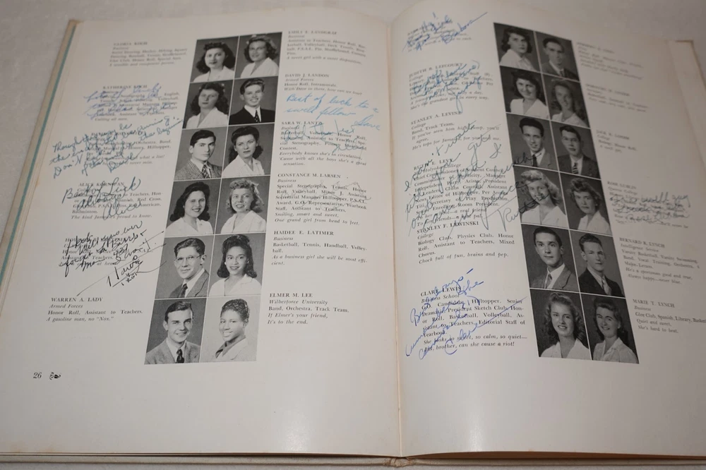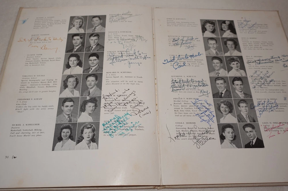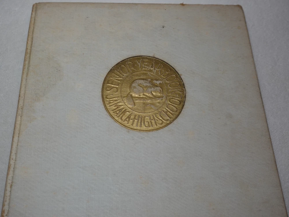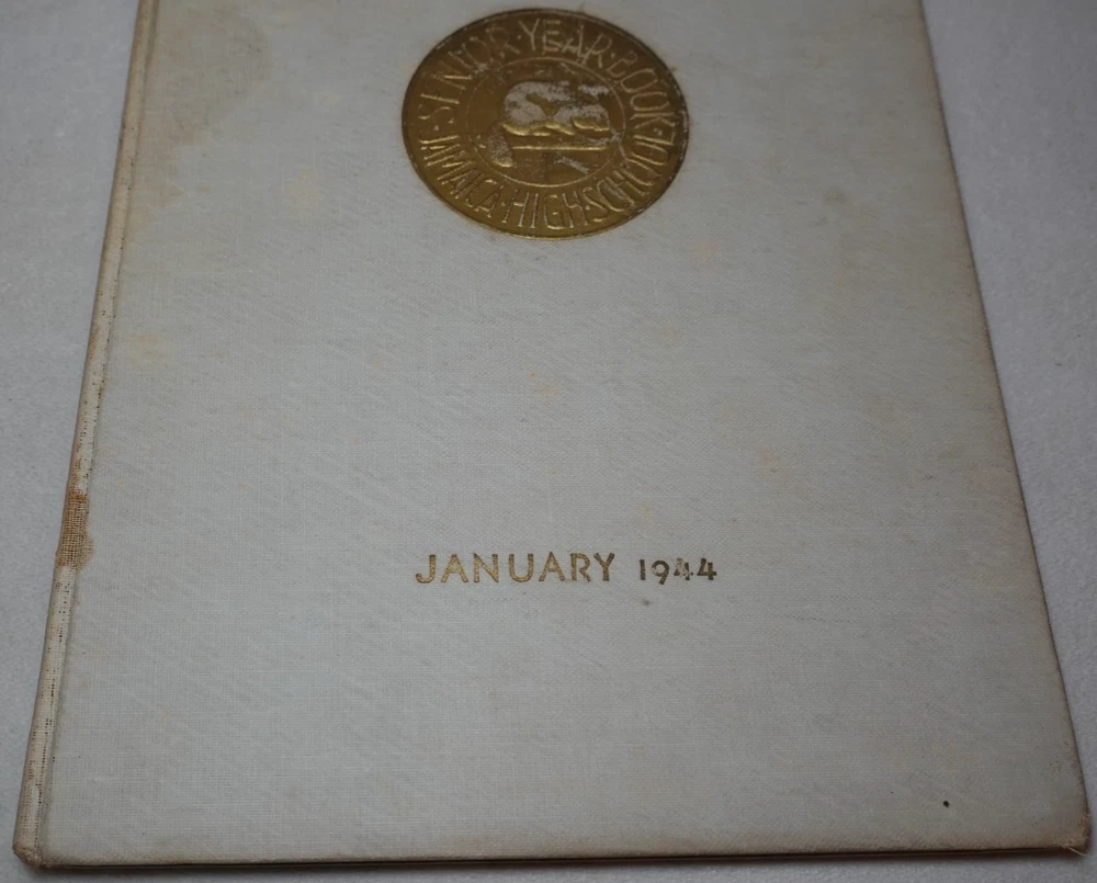 1944 Jamaica High School Queens New York Vintage Original Yearbook Over 200 Signatures Approximately 221 Signatures. Measures approximately 8 5/8" x 11 3/8". 60 Pages. Item is in vintage condition with dinged edges and corners, edge tearing, edge fraying, heavy staining to the covers and along the binding, indentions, age discoloration and marks. There is staining and discoloration inside the front and back covers. Yearbook has writing and marks throughout the publication. Please see photos for more information on condition and ask any questions you may have.