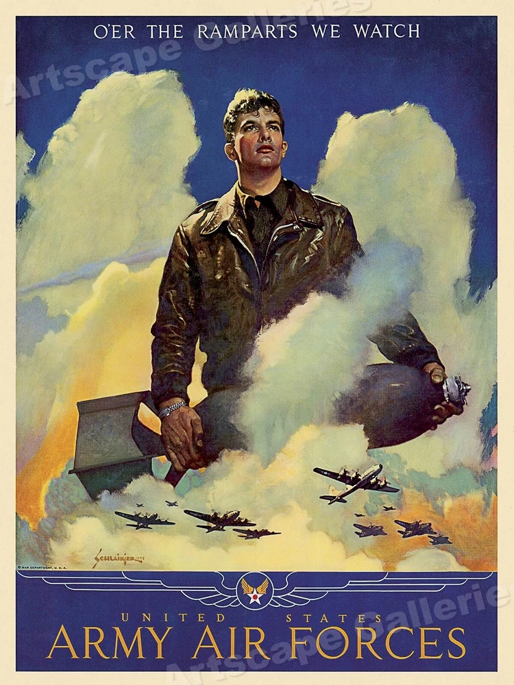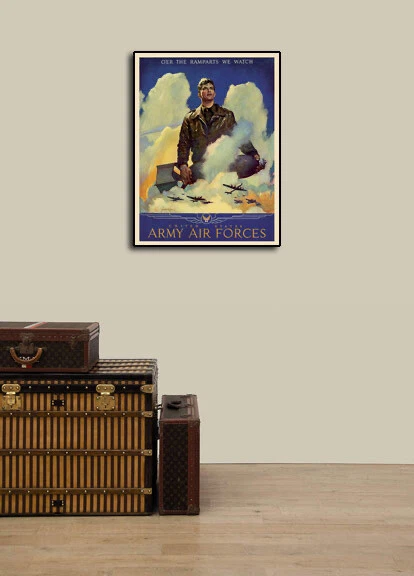 Artscape Galleries Posters from a Simpler Time . . . . . Store Categories Shipping USPS 1st Class USPS Priority Mail USPS 1st Class International Combined Shipping is available Return Policy We stand behind the quality of every print we sell. If you aren't satisfied with your purchase, contact us within 60 days to arrange for an exchange or a full refund. About Us Artscape Galleries is a family owned business based in Las Vegas, Nevada. We have been selling art prints exclusively online for over 15 years. With thousands of satisfied buyers ranging from Movie Studios to Museums, you will not be disappointed! Please vist our other eBay store! Feedback “Impressed! Vibrant colours, edge to edge print. Very excited to get it framed!” “Super fast delivery and the colors are amazingly rich. Thanks for everything!” “Terrific experience with this seller, we buy more from him than anyone on Ebay!” “WOW! Beautiful map! Lightning fast shipping, Very well packed, Great eBayerA++++” “Vibrant and bright! Pic does not do it justice...looks amazing!” Year: 1945 Size: 20"x28" This great Vintage Style World War 2 Poster shows shows a handsome pilot standing in the clouds, holding a bomb with both hands while wearing an I.D. bracelet and a leather bomber jacket. The caption reads: "O'er the ramparts we watch! United States Army Air Forces!" This Classic Vintage Style poster from WWII honors the beauty of this unique art form and evokes the vivid images of simpler times. Each of our prints are custom reproductions printed on 68lb Heavyweight Enhanced Matte Art Paper. These Historic Art Prints are suitable for framing, mounting or direct display on any wall! Graphics and template design by and copyright Artscape Galleries / Posters Past WW2103 Visit our store! 〉 © Artscape Galleries _gsrx_vers_1436 (GS 9.0.5 (1436))