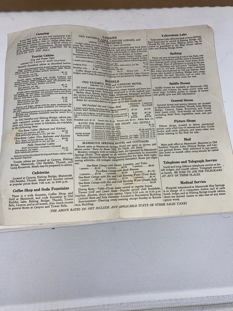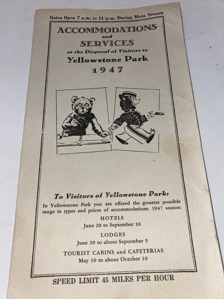 1947 Yellowstone Park Brochure, Accommodation & Services, Map . Shipped with USPS First Class Package. Overall very good condition, small rip as shown in last picture. Shipped in protective cardboard envelope. Write with any questions.