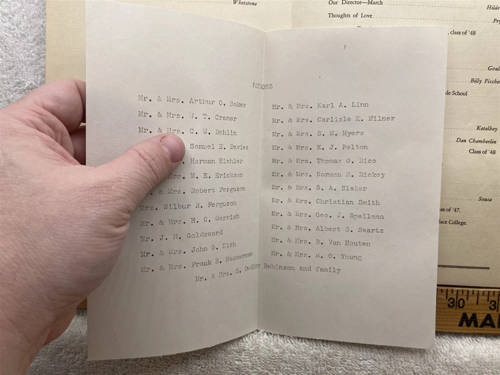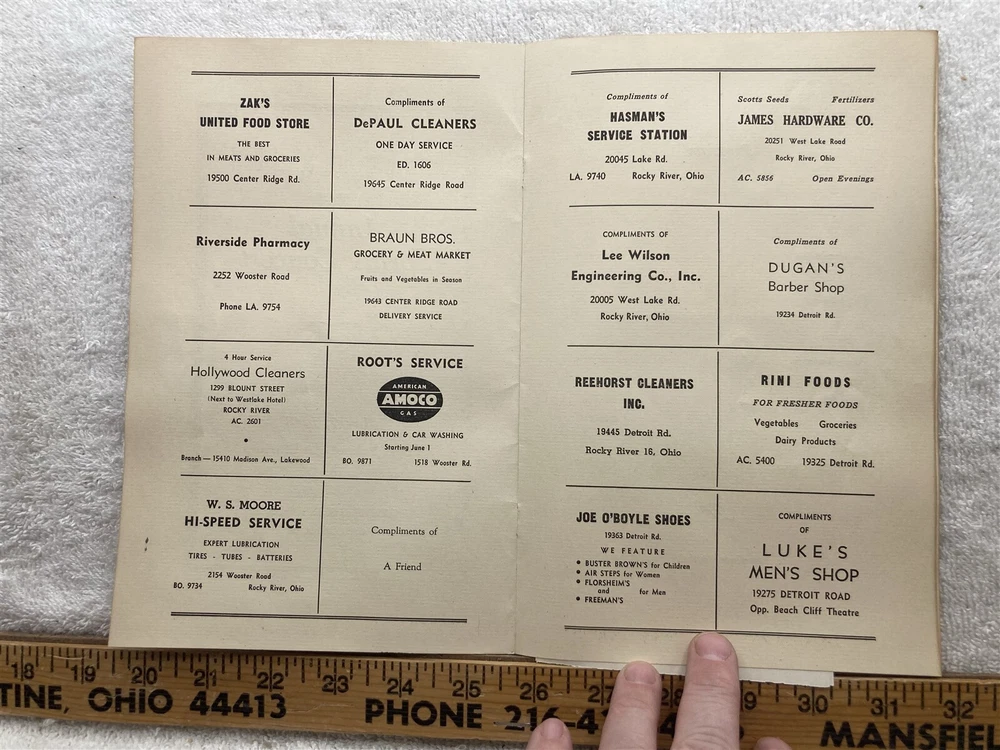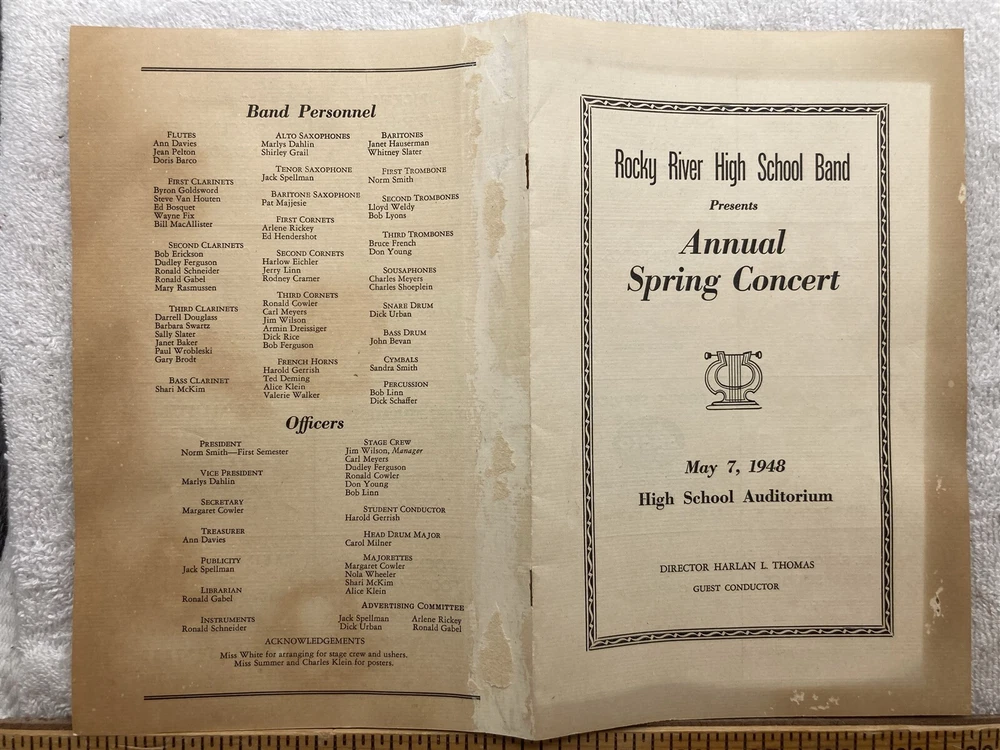 Original: 1948 Annual Spring Concert Program Rocky River High School Ohio. Please note - This was removed from an old scrap book. There may be glue residue, staple marks, paper stuck to the back, tears etc. You may or may not be able to remove the residue and paper if you took your time. I have 20,000 listings and don't have the time to address it. Please see the photographs for a detailed description as it will show most blemishes that the item has. Free shipping to all US addresses. Please note, my schedule only allows me to ship once a week (Usually close orders out at 5PM on Tuesdays and ship Wednesday Mornings), If you buy on Wednesday, it most likely not ship until the following Wednesday. It can take up to 5 business days for your item to ship, or it can ship the next day if you purchase on a Tuesday. I apologize in advance, and I beg for your patience, being on the road allows me to find these few and far between items. Please let me know if you need it by a deadline for a birthday or something and I'll see what I can do. For international buyers, please inquire about shipping if the shipping is showing above $24, the prices listed are default 4lbs priority and most likely is way above what it actually costs to ship. Powered by SixBit's eCommerce Solution