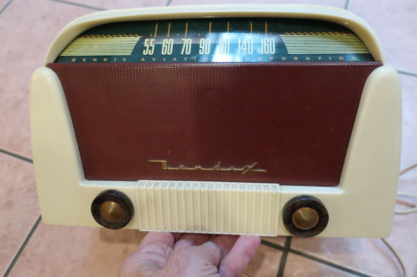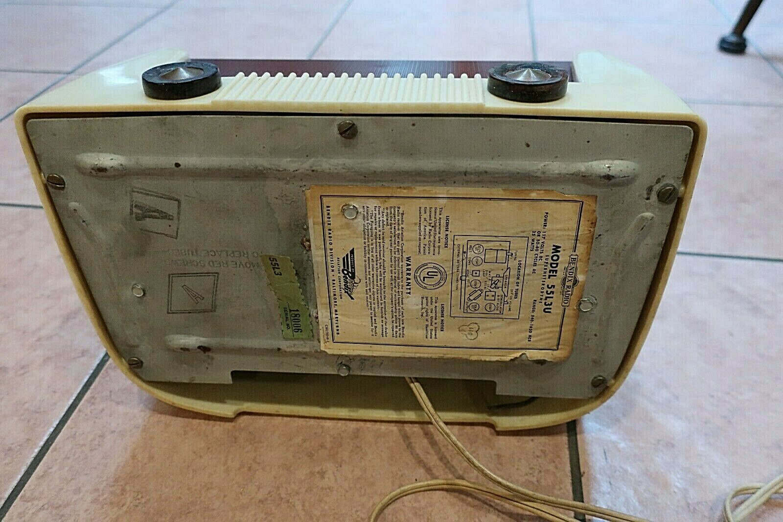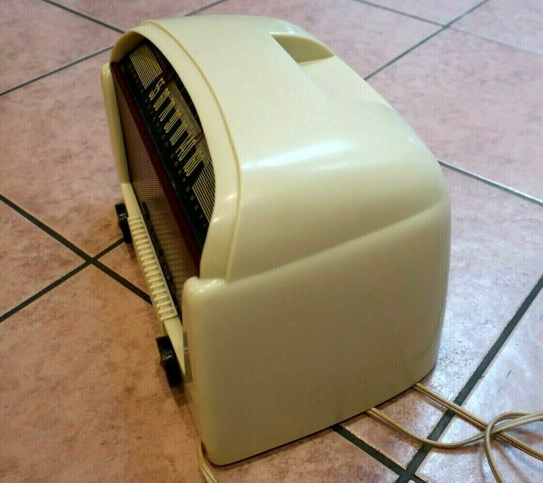 This radio chassis is in NM condition. No cracks or chips. Some tarnish on the two knobs on the front. Very desirable color combination for this model. It received several stations loud and clear, but when changing channels or on a quiet station you hear a background hum. I did not try it with an AM antenna attached. It measures about 10" long. It is packed in styrofoam walls and peanuts. Shipping cost is based on buyer's zip code. Nothing extra for handling. No reserve. I always try to describe accurately and take many pictures. Returns are given , no questions asked. I will try to help out with any problems.